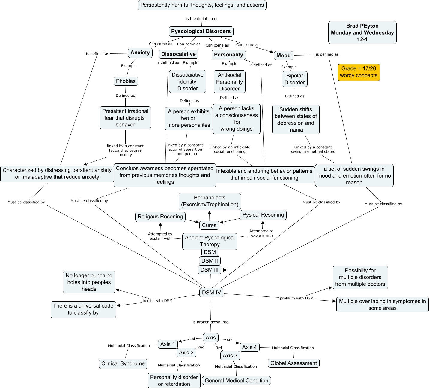 This Concept Map, created with IHMC CmapTools, has information related to: Brad Peyton Chapter 13 Disorders, DSM II ???? DSM, Characterized by distressing persitent anxiety or maladaptive that reduce anxiety Must be classified by DSM-IV, Bipolar Disorder Defined as Sudden shifts between states of depression and mania, Personality is defined as Infexible and enduring behavior patterns that impair social functioning, Axis 1st Axis 1, Pysical Resoning ???? Cures, Ancient Pychological Theropy Attempted to explain with Religous Resoning, Axis 4 Multiaxial Classification Global Assessment, A person exhibits two or more personalites linked by a constant factor of seprartion in one person Conciuos awarness becomes speratated from previous memories thoughts and feelings, DSM-IV is broken down into Axis, Religous Resoning ???? Cures, Pyscological Disorders Can come as Dissocaiative, DSM-IV benifit with DSM No longer punching holes into peoples heads, Mood Example Bipolar Disorder, a set of sudden swings in mood and emotion often for no reason Must be classified by DSM-IV, Pyscological Disorders Can come as Personality, Axis 1 Multiaxial Classification Clinical Syndrome, Dissocaiative Example Dissocaiative identity Disorder, Dissocaiative is defined as Conciuos awarness becomes speratated from previous memories thoughts and feelings, Antisocial Personality Disorder Defined as A person lacks a conscioussness for wrong doings