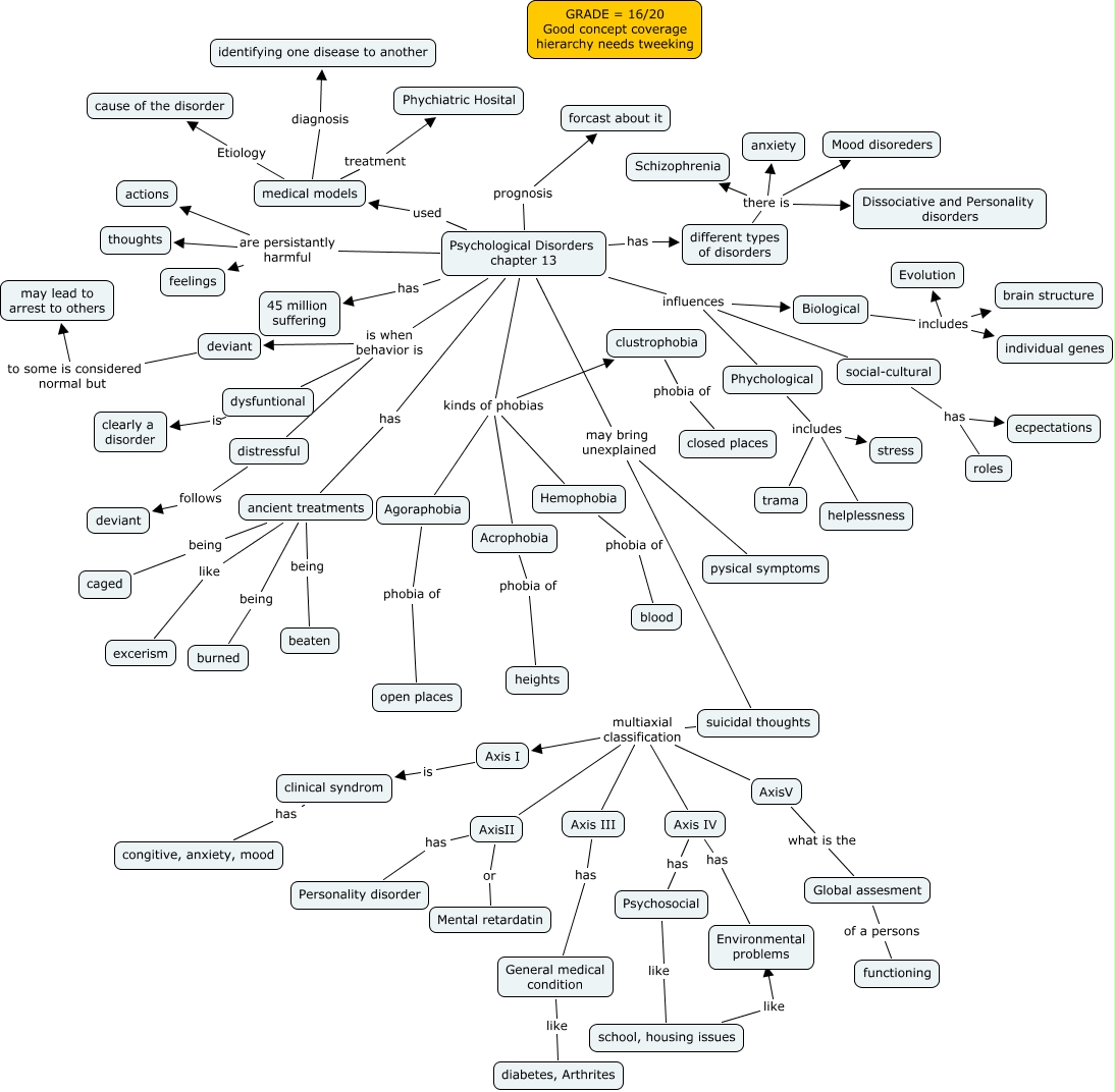 This Concept Map, created with IHMC CmapTools, has information related to: jessica dowden chpt 13, Phychological includes helplessness, suicidal thoughts multiaxial classification AxisV, Psychological Disorders chapter 13 kinds of phobias clustrophobia, suicidal thoughts multiaxial classification Axis I, Psychological Disorders chapter 13 is when behavior is dysfuntional, medical models Etiology cause of the disorder, school, housing issues like ????, distressful follows deviant, Agoraphobia phobia of open places, different types of disorders there is Dissociative and Personality disorders, Psychological Disorders chapter 13 may bring unexplained suicidal thoughts, Psychological Disorders chapter 13 kinds of phobias Hemophobia, Psychological Disorders chapter 13 are persistantly harmful feelings, Psychological Disorders chapter 13 is when behavior is deviant, Biological includes Evolution, Psychological Disorders chapter 13 are persistantly harmful thoughts, AxisV what is the Global assesment, Axis I is clinical syndrom, Axis IV has Environmental problems, Psychological Disorders chapter 13 are persistantly harmful actions
