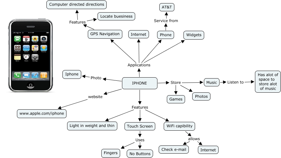 This Concept Map, created with IHMC CmapTools, has information related to: arosen13 - Technology, Touch Screen Uses Fingers, IPHONE Applications Internet, IPHONE Store Photos, Music Listen to Has alot of space to store alot of music, IPHONE Store Games, IPHONE Applications Widgets, IPHONE Applications GPS Navigation, IPHONE website www.apple.com/iphone, IPHONE Features Touch Screen, IPHONE Applications Phone, GPS Navigation Features Locate buesiness, IPHONE Photo Iphone, Touch Screen Uses No Buttons, IPHONE Store Music, IPHONE Features WiFi capibility, WiFi capibility allows Internet, IPHONE Features Light in weight and thin, Phone Service from AT&T, GPS Navigation Features Computer directed directions, WiFi capibility allows Check e-mail