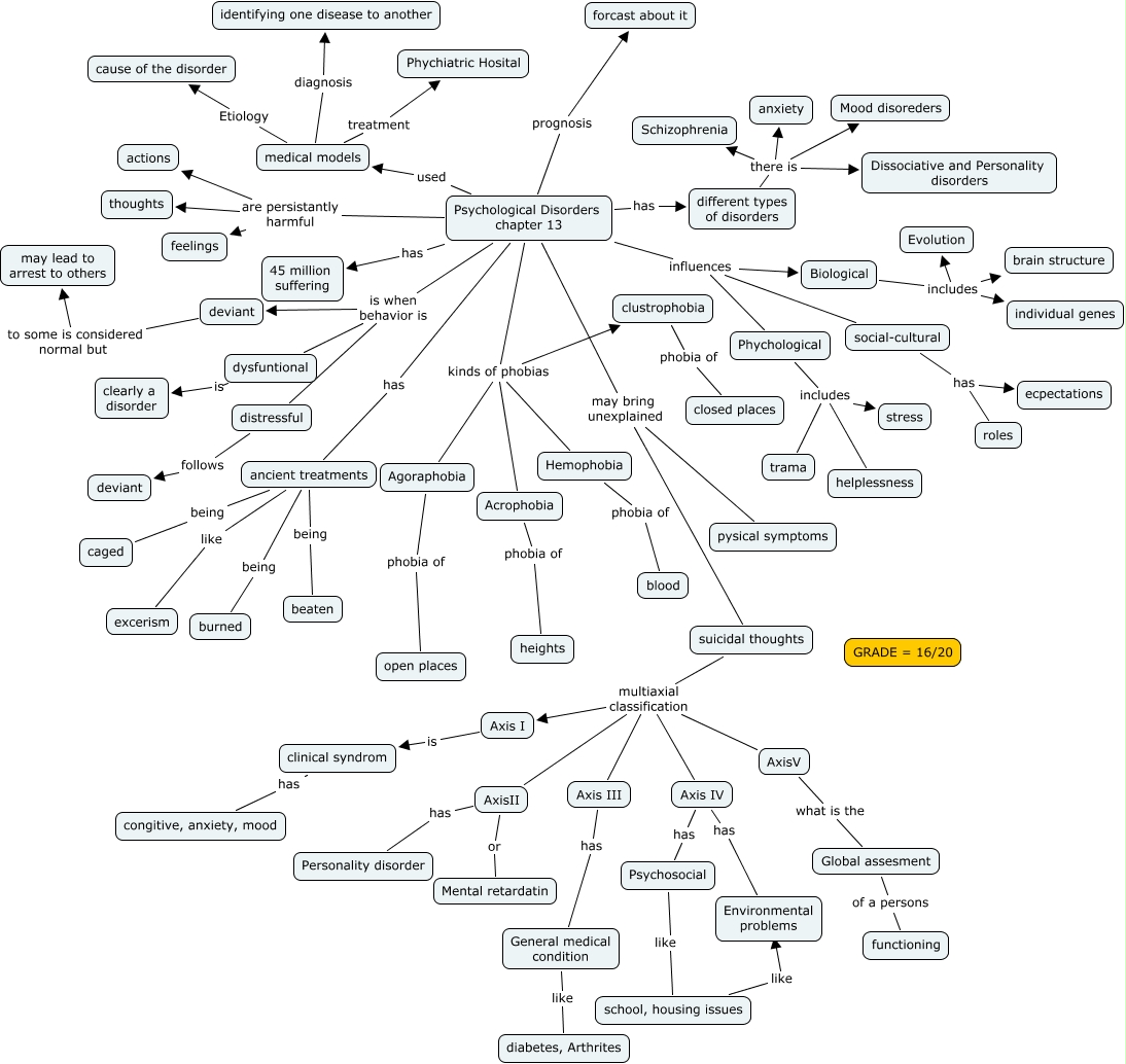 This Concept Map, created with IHMC CmapTools, has information related to: jessica dowden chpt 13, Phychological includes helplessness, Psychological Disorders chapter 13 is when behavior is dysfuntional, suicidal thoughts multiaxial classification Axis I, Psychological Disorders chapter 13 kinds of phobias clustrophobia, suicidal thoughts multiaxial classification AxisV, school, housing issues like ????, medical models Etiology cause of the disorder, distressful follows deviant, Psychological Disorders chapter 13 may bring unexplained suicidal thoughts, different types of disorders there is Dissociative and Personality disorders, Agoraphobia phobia of open places, Psychological Disorders chapter 13 kinds of phobias Hemophobia, Psychological Disorders chapter 13 is when behavior is deviant, Psychological Disorders chapter 13 are persistantly harmful feelings, Psychological Disorders chapter 13 are persistantly harmful thoughts, Biological includes Evolution, Axis I is clinical syndrom, AxisV what is the Global assesment, Psychological Disorders chapter 13 are persistantly harmful actions, Axis IV has Environmental problems