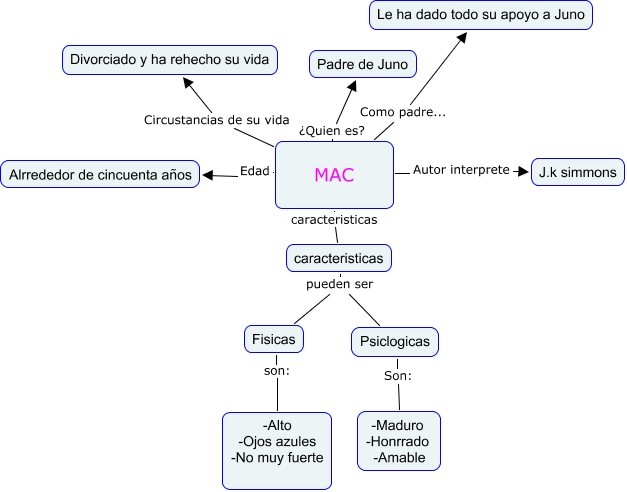 Este Cmap, tiene información relacionada con: JUNO p, caracteristicas pueden ser Fisicas, MAC Circustancias de su vida Divorciado y ha rehecho su vida, Fisicas son: -Alto -Ojos azules -No muy fuerte, MAC Como padre... Le ha dado todo su apoyo a Juno, caracteristicas pueden ser Psiclogicas, MAC Autor interprete J.k simmons, MAC Edad Alrrededor de cincuenta años, MAC ¿Quien es? Padre de Juno, Psiclogicas Son: -Maduro -Honrrado -Amable, MAC caracteristicas caracteristicas