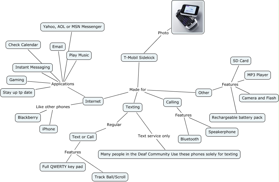 This Concept Map, created with IHMC CmapTools, has information related to: n1393530088_30447413_7323, Internet Applications Stay up tp date, T-Mobil Sidekick Made for Other, Internet Applications Email, Texting Regular Text or Call, T-Mobil Sidekick Photo ????, T-Mobil Sidekick Made for Internet, Internet Applications Instant Messaging, Internet Applications Gaming, Internet Applications Yahoo, AOL or MSN Messenger, Other Features Rechargeable battery pack, Calling Features Bluetooth, Other Features Camera and Flash, Internet Like other phones iPhone, T-Mobil Sidekick Made for Texting, Internet Applications Check Calendar, Other Features MP3 Player, Other Features SD Card, Text or Call Features Track Ball/Scroll, Calling Features Speakerphone, Internet Like other phones Blackberry