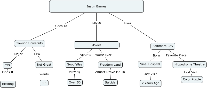 This Concept Map, created with IHMC CmapTools, has information related to: Justin Barnes, Sinai Hospital Last Visit 2 Years Ago, Baltimore City Favorite Place Hippodrome Theatre, Movies Worst Ever Freedom Land, CIS Finds It Exciting, Justin Barnes Goes To Towson University, Justin Barnes Lives Baltimore City, Hippodrome Theatre Last Visit Color Purple, Towson University Major CIS, Goodfellas Viewing Over 50, Freedom Land Almost Drove Me To Suicide, Baltimore City Born Sinai Hospital, Not Great Wants 3.5, Movies Favorite Goodfellas, Justin Barnes Loves Movies, Towson University GPA Not Great