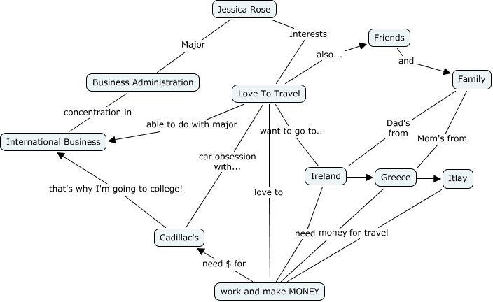 This Concept Map, created with IHMC CmapTools, has information related to: Jessica Rose, Cadillac's that's why I'm going to college! International Business, Family Dad's from Ireland, Ireland Greece, Ireland need work and make MONEY, Love To Travel also... Friends, Love To Travel car obsession with... Cadillac's, Greece money work and make MONEY, Greece Itlay, Jessica Rose Major Business Administration, Love To Travel able to do with major International Business, Jessica Rose Interests Love To Travel, Friends and Family, work and make MONEY need $ for Cadillac's, Itlay for travel work and make MONEY, Family Mom's from Greece, Love To Travel love to work and make MONEY, Love To Travel want to go to.. Ireland, Business Administration concentration in International Business