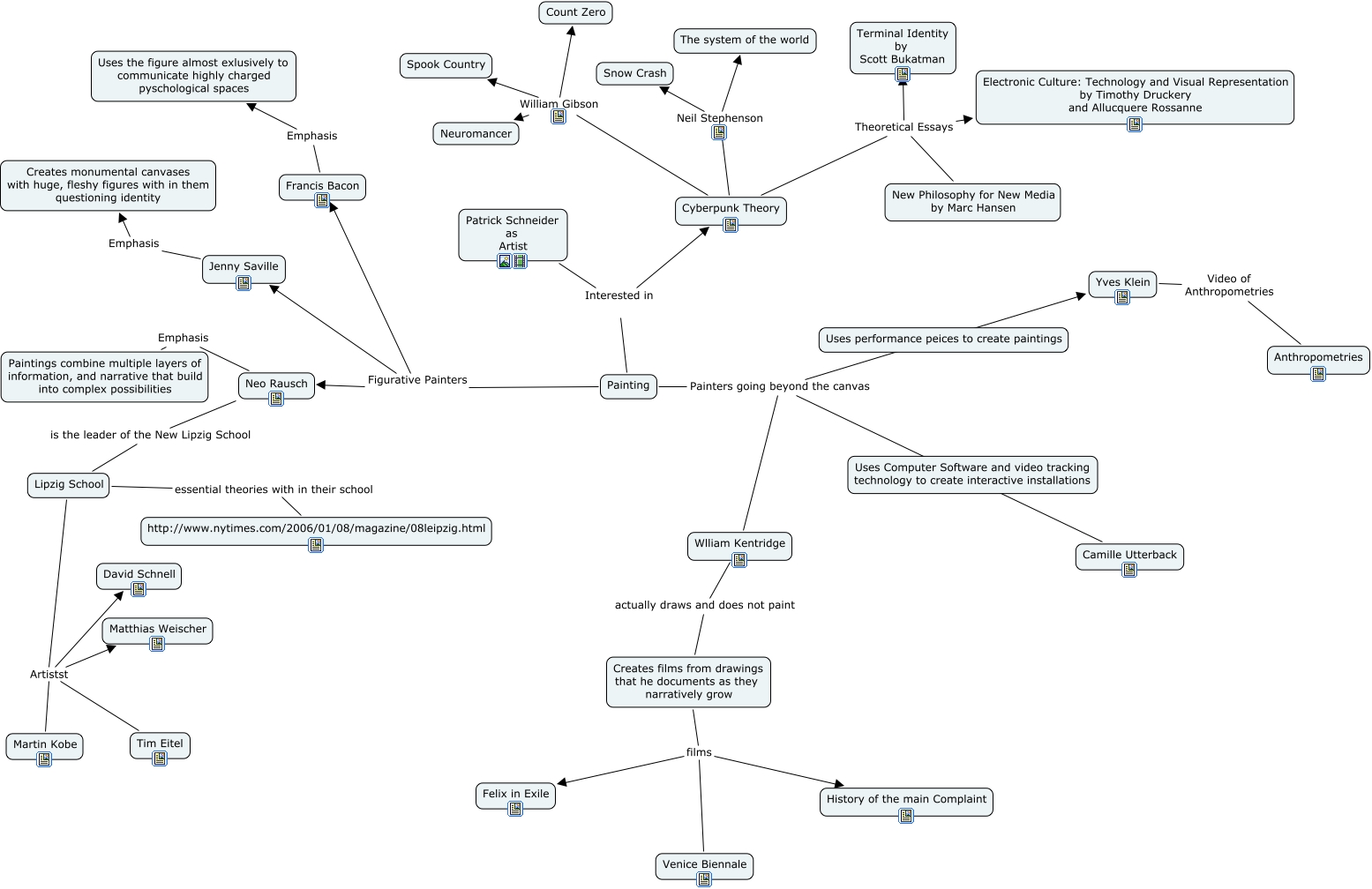 This Concept Map, created with IHMC CmapTools, has information related to: Patrick's research, Francis Bacon Emphasis Uses the figure almost exlusively to communicate highly charged pyschological spaces, Lipzig School Artistst Martin Kobe, Lipzig School essential theories with in their school http://www.nytimes.com/2006/01/08/magazine/08leipzig.html, Painting Figurative Painters Francis Bacon, Painting Painters going beyond the canvas Camille Utterback, Neo Rausch Emphasis Paintings combine multiple layers of information, and narrative that build into complex possibilities, Painting Painters going beyond the canvas Yves Klein, Creates films from drawings that he documents as they narratively grow films Venice Biennale, Painting Figurative Painters Jenny Saville, Painting Figurative Painters Neo Rausch, Patrick Schneider as Artist Interested in Painting, Cyberpunk Theory Neil Stephenson The system of the world, Wlliam Kentridge actually draws and does not paint Creates films from drawings that he documents as they narratively grow, Cyberpunk Theory Theoretical Essays New Philosophy for New Media by Marc Hansen, Painting Painters going beyond the canvas Wlliam Kentridge, Neo Rausch is the leader of the New Lipzig School Lipzig School, Cyberpunk Theory Neil Stephenson Snow Crash, Lipzig School Artistst Tim Eitel, Cyberpunk Theory Theoretical Essays Electronic Culture: Technology and Visual Representation by Timothy Druckery and Allucquere Rossanne, Creates films from drawings that he documents as they narratively grow films Felix in Exile