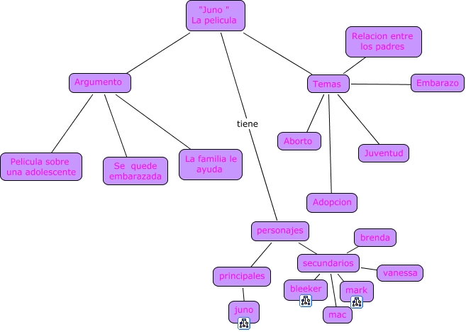 Este Cmap, tiene información relacionada con: juno la pelicula, Temas ???? Relacion entre los padres, Argumento ???? Pelicula sobre una adolescente, Argumento ???? Se quede embarazada, Argumento ???? Se quede embarazada, principales ???? juno, secundarios ???? mark, secundarios ???? vanessa, secundarios ???? bleeker, Temas ???? Adopcion, Temas ???? Juventud, personajes ???? secundarios, Temas ???? Aborto, secundarios ???? brenda, "Juno " La pelicula tiene personajes, personajes ???? principales, Temas ???? Embarazo, "Juno " La pelicula ???? Temas, "Juno " La pelicula ???? Argumento, secundarios ???? mac, Argumento ???? La familia le ayuda