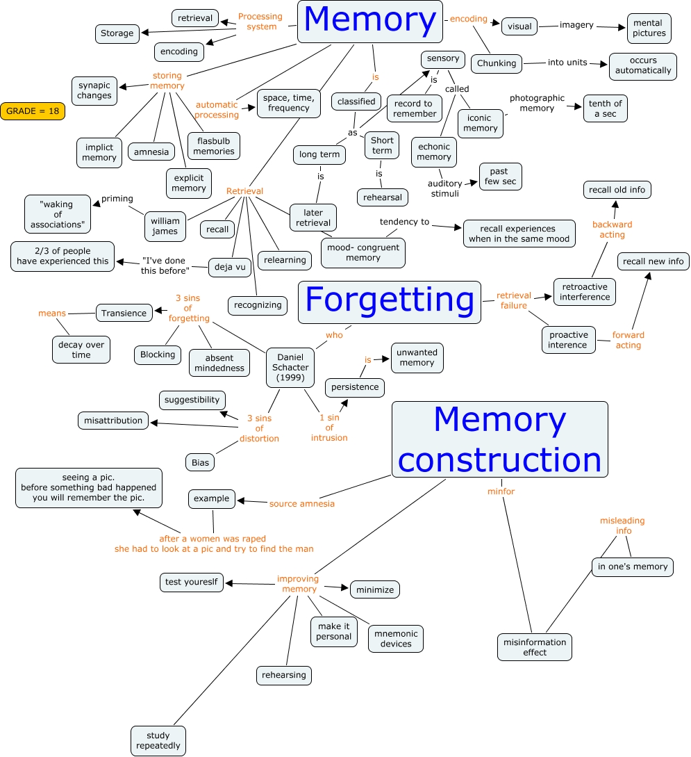 This Concept Map, created with IHMC CmapTools, has information related to: ch. 8 memory nichole maggard, classified as Short term, Daniel Schacter (1999) 3 sins of forgetting absent mindedness, Daniel Schacter (1999) 1 sin of intrusion persistence, Memory construction improving memory make it personal, echonic memory auditory stimuli past few sec, iconic memory photographic memory tenth of a sec, Memory Processing system Storage, long term is later retrieval, misinformation effect misleading info in one's memory, Forgetting retrieval failure retroactive interference, Memory construction minfor misinformation effect, Memory storing memory flasbulb memories, classified as sensory, sensory is record to remember, persistence is unwanted memory, Daniel Schacter (1999) 3 sins of distortion misattribution, Daniel Schacter (1999) 3 sins of distortion suggestibility, Memory Retrieval recognizing, Memory storing memory amnesia, deja vu "I've done this before" 2/3 of people have experienced this