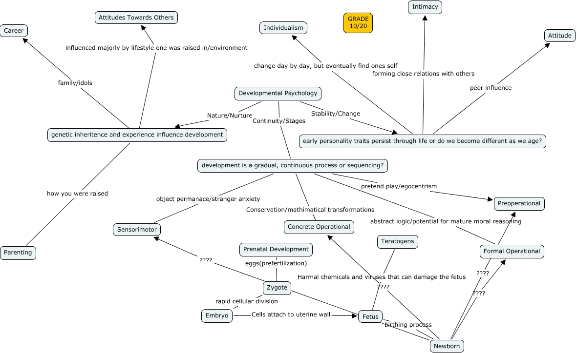 This Concept Map, created with IHMC CmapTools, has information related to: cmapjle1076ch.4, genetic inheritence and experience influence development family/idols Career, Newborn ???? Concrete Operational, Developmental Psychology Continuity/Stages development is a gradual, continuous process or sequencing?, development is a gradual, continuous process or sequencing? Conservation/mathimatical transformations Concrete Operational, Newborn ???? Formal Operational, Newborn ???? Preoperational, early personality traits persist through life or do we become different as we age? change day by day, but eventually find ones self Individualism, development is a gradual, continuous process or sequencing? pretend play/egocentrism Preoperational, Developmental Psychology Nature/Nurture genetic inheritence and experience influence development, Teratogens Harmal chemicals and viruses that can damage the fetus Fetus, early personality traits persist through life or do we become different as we age? peer influence Attitude, Prenatal Development eggs(prefertilization) Zygote, genetic inheritence and experience influence development how you were raised Parenting, development is a gradual, continuous process or sequencing? abstract logic/potential for mature moral reasoning Formal Operational, Developmental Psychology Stability/Change early personality traits persist through life or do we become different as we age?, Newborn ???? Sensorimotor, early personality traits persist through life or do we become different as we age? forming close relations with others Intimacy, development is a gradual, continuous process or sequencing? object permanace/stranger anxiety Sensorimotor, Zygote rapid cellular division Embryo, Embryo Cells attach to uterine wall Fetus