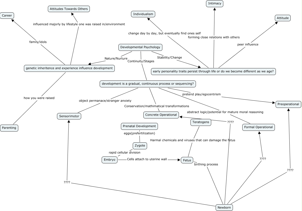 This Concept Map, created with IHMC CmapTools, has information related to: Jacob exum ch. 4, development is a gradual, continuous process or sequencing? Conservation/mathimatical transformations Concrete Operational, Developmental Psychology Continuity/Stages development is a gradual, continuous process or sequencing?, early personality traits persist through life or do we become different as we age? change day by day, but eventually find ones self Individualism, Developmental Psychology Nature/Nurture genetic inheritence and experience influence development, early personality traits persist through life or do we become different as we age? peer influence Attitude, Newborn ???? Preoperational, Newborn ???? Sensorimotor, Newborn ???? Formal Operational, development is a gradual, continuous process or sequencing? pretend play/egocentrism Preoperational, genetic inheritence and experience influence development influenced majorly by lifestyle one was raised in/environment Attitudes Towards Others, Newborn ???? Concrete Operational, Prenatal Development eggs(prefertilization) Zygote, Developmental Psychology Stability/Change early personality traits persist through life or do we become different as we age?, Teratogens Harmal chemicals and viruses that can damage the fetus Fetus, development is a gradual, continuous process or sequencing? abstract logic/potential for mature moral reasoning Formal Operational, Fetus birthing process Newborn, genetic inheritence and experience influence development how you were raised Parenting, Zygote rapid cellular division Embryo, genetic inheritence and experience influence development family/idols Career, early personality traits persist through life or do we become different as we age? forming close relations with others Intimacy
