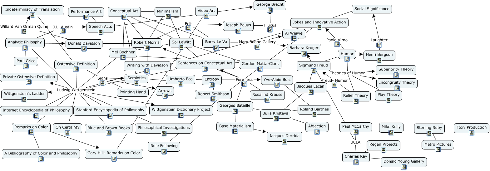 This Concept Map, created with IHMC CmapTools, has information related to: John Dickinson- Situated Art Practice, Ostensive Definition Signs Semiotics, Jokes and Innovative Action Ludwig Wittgenstein Internet Encyclopedia of Philosophy, Mel Bochner Ludwig Wittgenstein Remarks on Color, Robert Morris ???? Writing with Davidson, Robert Morris Felt Joseph Beuys, Umberto Eco ???? Entropy, Sentences on Conceptual Art Ludwig Wittgenstein Wittgenstein's Ladder, Ostensive Definition Signs Arrows, Gordon Matta-Clark ???? Mel Bochner, Joseph Beuys Fluxus George Brecht, Ostensive Definition Ludwig Wittgenstein Wittgenstein Dictionary Project, Roland Barthes ???? Yve-Alain Bois, Sentences on Conceptual Art Ludwig Wittgenstein Stanford Encyclopedia of Philosophy, Henri Bergson Laughter Social Significance, Conceptual Art ???? Mel Bochner, Philosophical Investigations ???? Rule Following, Entropy Formless Yve-Alain Bois, Paul McCarthy UCLA Barbara Kruger, Robert Morris ???? Minimalism, Robert Morris ???? Conceptual Art
