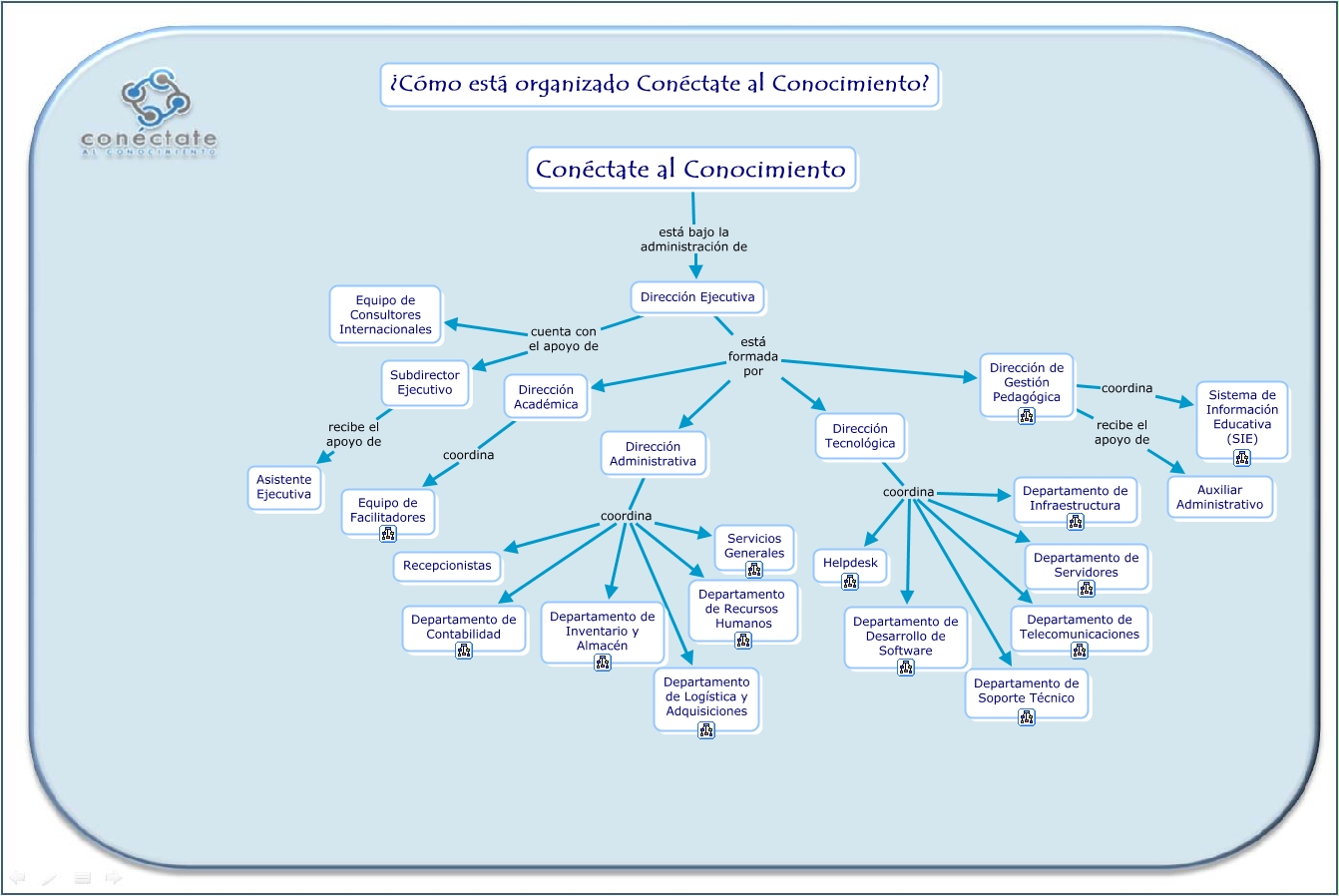 Este Cmap, tiene información relacionada con: Organigrama, Dirección Tecnológica coordina Departamento de Telecomunicaciones, Dirección Académica coordina Equipo de Facilitadores, Dirección de Gestión Pedagógica coordina Sistema de Información Educativa (SIE), Dirección Ejecutiva está formada por Dirección de Gestión Pedagógica, Dirección Administrativa coordina Departamento de Inventario y Almacén, Dirección Administrativa coordina Departamento de Logística y Adquisiciones, Dirección Tecnológica coordina Departamento de Infraestructura, Dirección Ejecutiva cuenta con el apoyo de Equipo de Consultores Internacionales, Dirección Ejecutiva está formada por Dirección Académica, Dirección Administrativa coordina Recepcionistas, Conéctate al Conocimiento está bajo la administración de Dirección Ejecutiva, Dirección Tecnológica coordina Helpdesk, Dirección Tecnológica coordina Departamento de Desarrollo de Software, Subdirector Ejecutivo recibe el apoyo de Asistente Ejecutiva, Dirección Ejecutiva está formada por Dirección Administrativa, Dirección Ejecutiva cuenta con el apoyo de Subdirector Ejecutivo, Dirección Administrativa coordina Servicios Generales, Dirección Administrativa coordina Departamento de Recursos Humanos, Dirección de Gestión Pedagógica recibe el apoyo de Auxiliar Administrativo, Dirección Administrativa coordina Departamento de Contabilidad