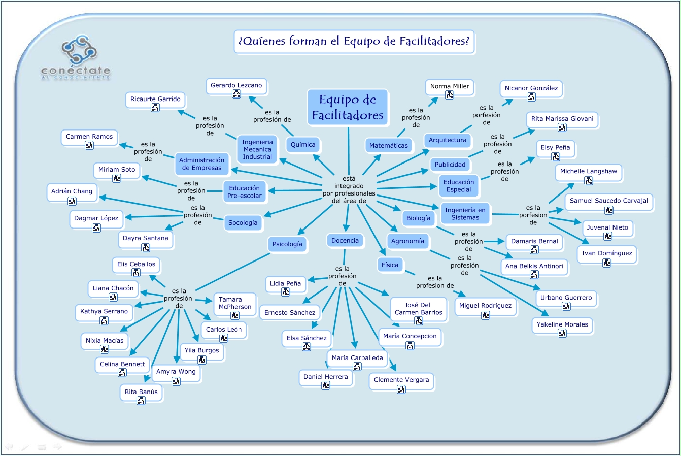 Este Cmap, tiene información relacionada con: Equipo de Facilitadores - Listado, Docencia es la profesión de María Concepcion, Equipo de Facilitadores está integrado por profesionales del área de Psicología, Equipo de Facilitadores está integrado por profesionales del área de Química, Equipo de Facilitadores está integrado por profesionales del área de Matemáticas, Equipo de Facilitadores está integrado por profesionales del área de Biología, Equipo de Facilitadores está integrado por profesionales del área de Docencia, Equipo de Facilitadores está integrado por profesionales del área de Física, Equipo de Facilitadores está integrado por profesionales del área de Publicidad, Psicología es la profesión de Liana Chacón, Ingenieria Mecanica Industrial es la profesión de Ricaurte Garrido, Biología es la profesión de Ana Belkis Antinori, Educación Pre-escolar es la profesión de Miriam Soto, Agronomía es la profesión de Urbano Guerrero, Agronomía es la profesión de Yakeline Morales, Docencia es la profesión de María Carballeda, Docencia es la profesión de Clemente Vergara, Docencia es la profesión de Ernesto Sánchez, Educación Especial es la profesión de Elsy Peña, Equipo de Facilitadores está integrado por profesionales del área de Arquitectura, Equipo de Facilitadores está integrado por profesionales del área de Educación Pre-escolar