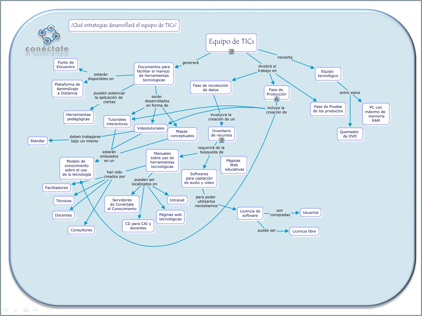 Este Cmap, tiene información relacionada con: Planificación- Tecnología de información y comunicación, Licencia de software son compradas Usuarios, Manuales sobre uso de herramientas tecnológicas pueden ser localizados en Intranet, Fase de Producción incluye la creación de Videotutoriales, Manuales sobre uso de herramientas tecnológicas han sido creados por Facilitadores, Equipo de TICs necesita Equipo tecnológico, Equipo de TICs generará Documentos para facilitar el manejo de herramientas tecnologicas, Equipo de TICs dividirá el trabajo en Fase de Prueba de los productos, Documentos para facilitar el manejo de herramientas tecnologicas serán desarrollados en forma de Tutoriales interactivos, Videotutoriales estarán enlazados en un Modelo de conocimiento sobre el uso de la tecnología, Inventario de recursos requerirá de la búsqueda de Manuales sobre uso de herramientas tecnológicas, Inventario de recursos requerirá de la búsqueda de Páginas Web educativas, Manuales sobre uso de herramientas tecnológicas han sido creados por Docentes, Manuales sobre uso de herramientas tecnológicas pueden ser localizados en Páginas web tecnológicas, Equipo de TICs dividirá el trabajo en Fase de recolección de datos, Licencia de software puede ser Licencia libre, Manuales sobre uso de herramientas tecnológicas pueden ser localizados en Servidores de Conéctate al Conocimiento, Mapas conceptuales estarán enlazados en un Modelo de conocimiento sobre el uso de la tecnología, Softwares para captación de audio y video para poder utilizarlos necesitamos Licencia de software, Fase de recolección de datos involucra la creación de un Inventario de recursos, Equipo de TICs dividirá el trabajo en Fase de Producción
