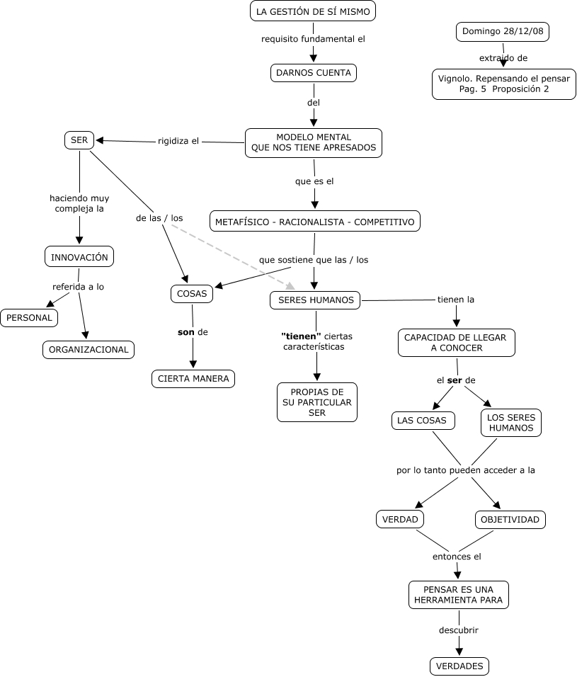 Este Cmap, tiene información relacionada con: GESTIÓN DE SÍ MISMO, INNOVACIÓN referida a lo PERSONAL, COSAS son de CIERTA MANERA, DARNOS CUENTA del MODELO MENTAL QUE NOS TIENE APRESADOS, VERDAD entonces el PENSAR ES UNA HERRAMIENTA PARA, OBJETIVIDAD entonces el PENSAR ES UNA HERRAMIENTA PARA, MODELO MENTAL QUE NOS TIENE APRESADOS que es el METAFÍSICO - RACIONALISTA - COMPETITIVO, CAPACIDAD DE LLEGAR A CONOCER el ser de LOS SERES HUMANOS, LA GESTIÓN DE SÍ MISMO requisito fundamental el DARNOS CUENTA, SER de las / los COSAS, SER haciendo muy compleja la INNOVACIÓN, LAS COSAS por lo tanto pueden acceder a la VERDAD, METAFÍSICO - RACIONALISTA - COMPETITIVO que sostiene que las / los SERES HUMANOS, SERES HUMANOS tienen la CAPACIDAD DE LLEGAR A CONOCER, METAFÍSICO - RACIONALISTA - COMPETITIVO que sostiene que las / los COSAS, Domingo 28/12/08 extraido de Vignolo. Repensando el pensar Pag. 5 Proposición 2, MODELO MENTAL QUE NOS TIENE APRESADOS rigidiza el SER, LOS SERES HUMANOS por lo tanto pueden acceder a la OBJETIVIDAD, LOS SERES HUMANOS por lo tanto pueden acceder a la VERDAD, SERES HUMANOS "tienen" ciertas características PROPIAS DE SU PARTICULAR SER, SER de las / los SERES HUMANOS