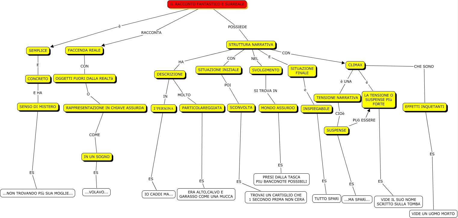 Questa Cmap, creata con IHMC CmapTools, contiene informazioni relative a: IL RACCONTO FANTASTICO E SURREALE, STRUTTURA NARRATIVA E SITUAZIONE FINALE, CLIMAX è UNA TENSIONE NARRATIVA, SCONVOLTA ES TROVAI UN CARTIGLIO CHE 1 SECONDO PRIMA NON CERA, LA TENSIONE O SUSPENSE PIù FORTE ES VIDE IL SUO NOME SCRITTO SULLA TOMBA, CLIMAX è LA TENSIONE O SUSPENSE PIù FORTE, IL RACCONTO FANTASTICO E SURREALE è SEMPLICE, EFFETTI INQUETANTI ES VIDE UN UOMO MORTO, SUSPENSE ES ...MA SPARì..., IN UN SOGNO ES ...VOLAVO..., 1°PERSONA ES IO CADDI MA..., SVOLGIMENTO SI TROVA IN MONDO ASSURDO, FACCENDA REALE CON OGGETTI FUORI DALLA REALTà, STRUTTURA NARRATIVA CON CLIMAX, OGGETTI FUORI DALLA REALTà O RAPPRESENTAZIONE IN CHIAVE ASSURDA, RAPPRESENTAZIONE IN CHIAVE ASSURDA COME IN UN SOGNO, DESCRIZIONE IN 1°PERSONA, SENSO DI MISTERO ES ...NON TROVANDO PIù SUA MOGLIE..., IL RACCONTO FANTASTICO E SURREALE POSSIEDE STRUTTURA NARRATIVA, STRUTTURA NARRATIVA CON SITUAZIONE INIZIALE, STRUTTURA NARRATIVA HA DESCRIZIONE