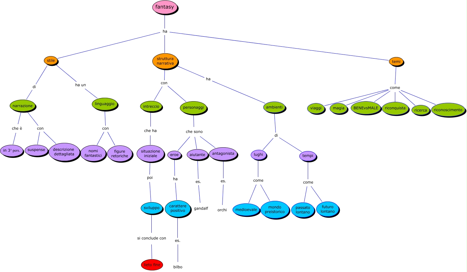 Questa Cmap, creata con IHMC CmapTools, contiene informazioni relative a: fantasy, temi come ricerca, temi come riconoscimento, personaggi che sono eroe, linguaggio con nomi fantastici, fantasy ha temi, situazione iniziale poi sviluppo, antagonista es. orchi, aiutante es. gandalf, linguaggio con figure retoriche, ambienti di lughi, intreccio che ha situazione iniziale, narrazione con suspense, tempi come futuro lontano, stile di narrazione, temi come BENEvsMALE, personaggi che sono antagonista, struttura narrativa con intreccio, stile ha un linguaggio, struttura narrativa ha ambienti, personaggi che sono aiutante