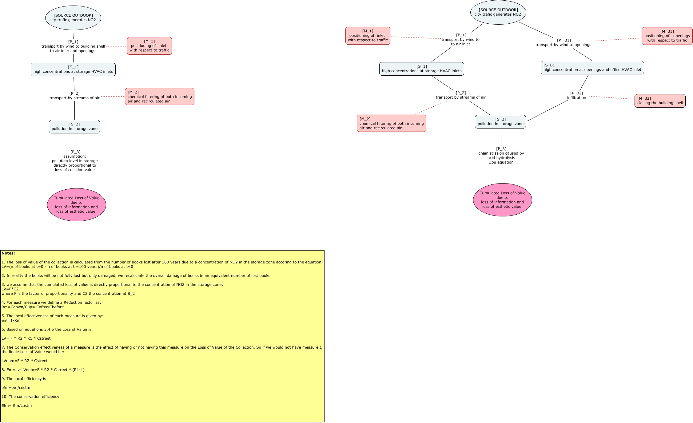 Deze Concept Map heeft informatie gerelateerd aan: simplified linear version of the pollution pathway diagram, [S_2] pollution in storage zone [P_3] chain scission caused by acid hydrolysis Zou equation Cumulated Loss of Value due to loss of information and loss of esthetic value, [SOURCE OUTDOOR] city trafic generates NO2 [P_1] transport by wind to building shell to air inlet and openings [S_1] high concentrations at storage HVAC inlets, [S_1] high concentrations at storage HVAC inlets [P_2] transport by streams of air [S_2] pollution in storage zone, [M_B1] positioning of openings with respect to traffic [P_ B1] transport by wind to openings [S_B1] high concentration at openings and office HVAC inlet, [SOURCE OUTDOOR] city trafic generates NO2 [P_ B1] transport by wind to openings [S_B1] high concentration at openings and office HVAC inlet, [SOURCE OUTDOOR] city trafic generates NO2 [P_1] transport by wind to to air inlet [S_1] high concentrations at storage HVAC inlets, [M_B2] closing the building shell [P_B2] infiltration [S_2] pollution in storage zone, [M_1] positioning of inlet with respect to traffic [P_1] transport by wind to building shell to air inlet and openings [S_1] high concentrations at storage HVAC inlets, [M_1] positioning of inlet with respect to traffic [P_1] transport by wind to to air inlet [S_1] high concentrations at storage HVAC inlets, [M_2] chemical filtering of both incoming air and recirculated air [P_2] transport by streams of air [S_2] pollution in storage zone, [S_1] high concentrations at storage HVAC inlets [P_2] transport by streams of air [S_2] pollution in storage zone, [S_B1] high concentration at openings and office HVAC inlet [P_B2] infiltration [S_2] pollution in storage zone, [M_2] chemical filtering of both incoming air and recirculated air [P_2] transport by streams of air [S_2] pollution in storage zone, [S_2] pollution in storage zone [P_3] assumption: pollution level in storage directly proportional to loss of collction value Cumulated Loss of Value due to loss of information and loss of esthetic value