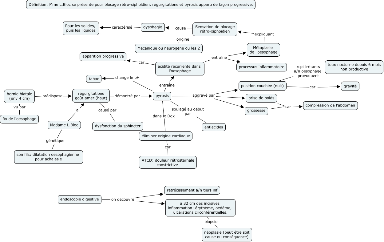 Cette carte conceptuelle, cree avec IHMC CmapTools, contient des informations liees a : App 1- aller, éliminer origine cardiaque car ATCD: douleur rétrosternale constrictive, endoscopie digestive on découvre rétrécissement a/n tiers inf, pyrosis aggravé par grossesse, position couchée (nuit) rcpt irritants a/n oesophage provoquent toux nocturne depuis 6 mois non productive, pyrosis aggravé par position couchée (nuit), hernie hiatale (env 4 cm) prédispose régurgitations goût amer (haut), à 32 cm des incisives inflammation: érythème, oedème, ulcérations circonférentielles. biopsie néoplasie (peut être soit cause ou conséquence), Métaplasie de l'oesophage expliquant Sensation de blocage rétro-xiphoïdien, pyrosis entraîne acidité récurrente dans l'oesophage, acidité récurrente dans l'oesophage entraîne Métaplasie de l'oesophage, Madame L.Bloc génétique son fils: dilatation oesophagienne pour achalasie, acidité récurrente dans l'oesophage car apparition progressive, dysphagie caractérisé Pour les solides, puis les liquides, pyrosis change le pH tabac, position couchée (nuit) car gravité, Sensation de blocage rétro-xiphoïdien origine Mécanique ou neurogène ou les 2, pyrosis soulagé au début par antiacides, endoscopie digestive on découvre à 32 cm des incisives inflammation: érythème, oedème, ulcérations circonférentielles., Madame L.Bloc a régurgitations goût amer (haut), hernie hiatale (env 4 cm) vu par Rx de l'oesophage