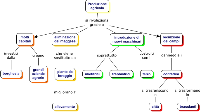 Questa Cmap, creata con IHMC CmapTools, contiene informazioni relative a: 332) Rivoluzione agricola, molti capitali creano grandi aziende agrarie, contadini si trasformano in braccianti, Produzione agricola si rivoluziona grazie a molti capitali, contadini si trasferiscono in città, Produzione agricola si rivoluziona grazie a recinzione dei campi, introduzione di nuovi macchinari soprattutto trebbiatrici, introduzione di nuovi macchinari costruiti con il ferro, Produzione agricola si rivoluziona grazie a eliminazione del maggese, Produzione agricola si rivoluziona grazie a introduzione di nuovi macchinari, introduzione di nuovi macchinari soprattutto mietitrici, eliminazione del maggese che viene sostituito da piante da foraggio, molti capitali investiti dalla borghesia, recinzione dei campi danneggia i contadini, piante da foraggio migliorano l' allevamento