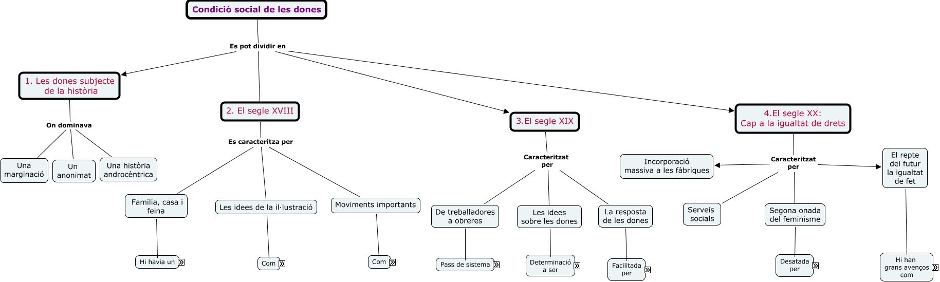 Este Cmap, tiene información relacionada con: Michelle Galeano Galicia, Que va originar Declaració dels drets de la dona (Olympe de Gouges al 1791), 1. Les dones subjecte de la història On dominava Un anonimat, De treballadores a obreres Pass de sistema Domèstic, Moviments importants Com Querelle des femes, Una crisis de valors Va tenir objestius com Qüestionar la divisió de papers i l'estructura tradicional de la família (maternitat), Classificació segons la llei i la moral Matrimoni, Una crisis de valors Va tenir objestius com Desigualtat de fet, Doble jornada laboral Caracteritzada per Discriminació salarial, Llibertat Que va originar, La resposta de les dones Facilitada per Un moviment sufragista, Esposa ???? una determinació recolzada per, Condició social de les dones Es pot dividir en 1. Les dones subjecte de la història, Les idees sobre les dones Determinació a ser Mare, 2. El segle XVIII Es caracteritza per Família, casa i feina, Un moviment sufragista Que va aconseguir Campanya contra el vici (Josephine Butler), 4.El segle XX: Cap a la igualtat de drets Caracteritzat per Segona onada del feminisme, Condició social de les dones Es pot dividir en 3.El segle XIX, Família, casa i feina Hi havia un Protagonisme de les dones a les manufactures tèxtils, 2. El segle XVIII Es caracteritza per Moviments importants, Un moviment sufragista Que va aconseguir Dret al vot de les dones solteres amb propietats