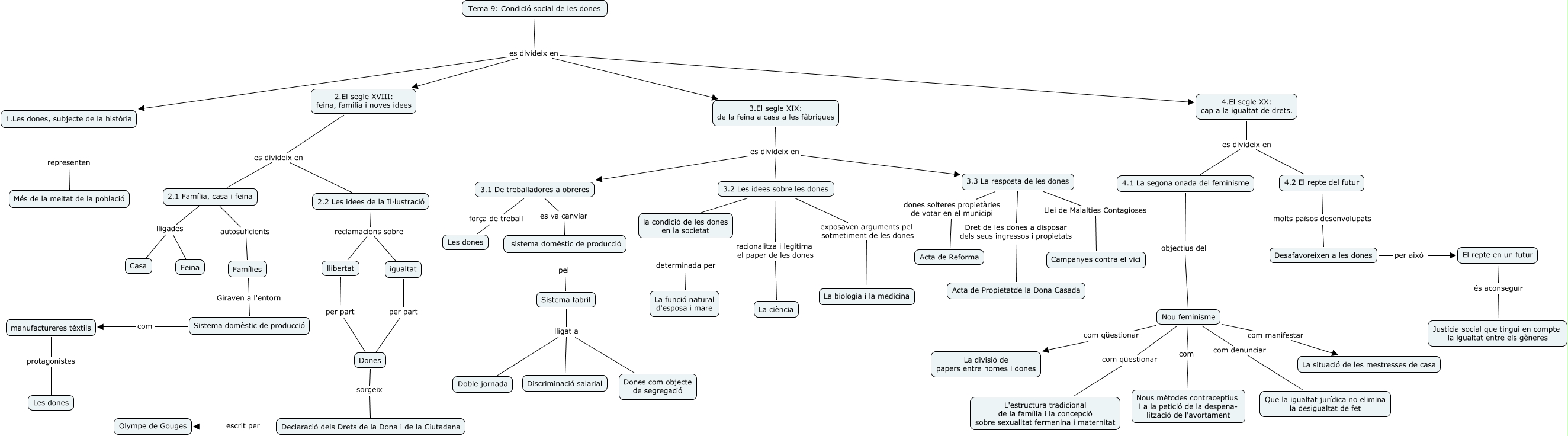 Este Cmap, tiene información relacionada con: Andrea Cortés Almazán, Famílies Giraven a l'entorn Sistema domèstic de producció, 1.Les dones, subjecte de la història representen Més de la meitat de la població, 2.El segle XVIII: feina, familia i noves idees es divideix en 2.2 Les idees de la Il·lustració, Sistema fabril lligat a Discriminació salarial, llibertat per part Dones, Sistema fabril lligat a Dones com objecte de segregació, Nou feminisme com Nous mètodes contraceptius i a la petició de la despena- lització de l'avortament, 2.2 Les idees de la Il·lustració reclamacions sobre llibertat, igualtat per part Dones, 4.El segle XX: cap a la igualtat de drets. es divideix en 4.1 La segona onada del feminisme, El repte en un futur és aconseguir Justícia social que tingui en compte la igualtat entre els gèneres, 2.1 Família, casa i feina lligades Feina, Nou feminisme com qüestionar L'estructura tradicional de la família i la concepció sobre sexualitat fermenina i maternitat, Tema 9: Condició social de les dones es divideix en 2.El segle XVIII: feina, familia i noves idees, 3.3 La resposta de les dones Llei de Malalties Contagioses Campanyes contra el vici, 3.3 La resposta de les dones Dret de les dones a disposar dels seus ingressos i propietats Acta de Propietatde la Dona Casada, 3.2 Les idees sobre les dones racionalitza i legitima el paper de les dones La ciència, 4.2 El repte del futur molts països desenvolupats Desafavoreixen a les dones, 2.2 Les idees de la Il·lustració reclamacions sobre igualtat, Desafavoreixen a les dones per això El repte en un futur