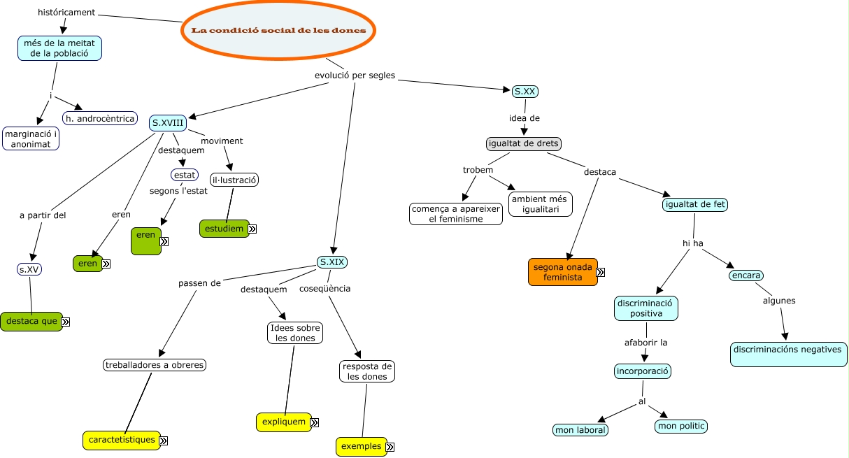 Este Cmap, tiene información relacionada con: Tema 9- Daniel Tornay, La condició social de les dones evolució per segles S.XIX, 1791 es fa declaració dels drets de la dona, treballadores a obreres es fa doble jornada laboral, il·lustració idees igualtat, igualtat de fet hi ha discriminació positiva, igualtat de drets destaca segona onada feminista, S.XVIII a partir del s.XV, s.XV dones com Mary Astel i Christine de Pizan, segona onada feminista es nou feminisme, autosuficients a casa, il·lustració ambit clubs de dones de la noblesa, La condició social de les dones evolució per segles S.XVIII, treballadores a obreres es passa de sistema domestic de produccio, treballadores a obreres provoca conflicte, sistema domestic de produccio al sistema fabril, conflicte de posar en perill la consideracio tradicional, igualtat de drets destaca igualtat de fet, estat segons l'estat eren, S.XVIII moviment il·lustració, al camp on obtenien aliments neccesaris