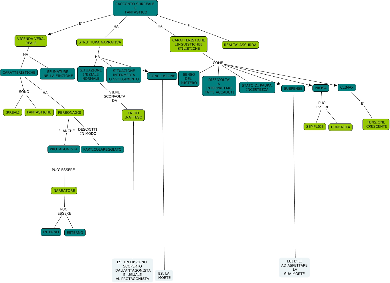 Questa Cmap, creata con IHMC CmapTools, contiene informazioni relative a: TESTO SUREALE E FANTASTICO, CARATTERISTICHE SONO FANTASTICHE, CARATTERISTICHE LINGUISTICHEE STILISTICHE COME SUSPENSE, RACCONTO SURREALE E FANTASTICO HA CARATTERISTICHE LINGUISTICHEE STILISTICHE, PROSA PUO' ESSERE SEMPLICE, CARATTERISTICHE LINGUISTICHEE STILISTICHE COME SENSO DEL MISTERO, NARRATORE PUO' ESSERE INTERNO, PROSA PUO' ESSERE CONCRETA, CARATTERISTICHE LINGUISTICHEE STILISTICHE COME DIFFICOLTA' A INTERPRETARE FATTI ACCADUTI, CARATTERISTICHE LINGUISTICHEE STILISTICHE COME PROSA, STRUTTURA NARRATIVA HA SITUAZIONE INIZIALE NORMALE, CARATTERISTICHE SONO IRREALI, RACCONTO SURREALE E FANTASTICO E' REALTA' ASSURDA, CARATTERISTICHE HA PERSONAGGI, VICENDA VERA, REALE HA SFUMATURE NELLA FINZIONE, FATTO INATTESO ES ES. UN DISEGNO SCOPERTO DALL'ANTAGONISTA E' UGUALE AL PROTAGONISTA, RACCONTO SURREALE E FANTASTICO HA STRUTTURA NARRATIVA, SITUAZIONE INIZIALE NORMALE VIENE SCONVOLTA DA FATTO INATTESO, STRUTTURA NARRATIVA HA CONCLUSIONE, STRUTTURA NARRATIVA HA SITUAZIONE INTERMEDIA O SVOLGIMENTO, RACCONTO SURREALE E FANTASTICO E' VICENDA VERA, REALE