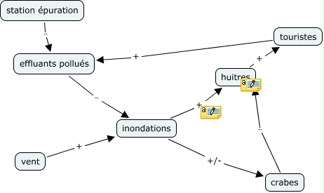 This Concept Map, created with IHMC CmapTools, has information related to: inondationGG, station épuration - effluants pollués, effluants pollués - inondations, huitres + touristes, crabes - huitres, touristes + effluants pollués, inondations + huitres, inondations +/- crabes, vent + inondations