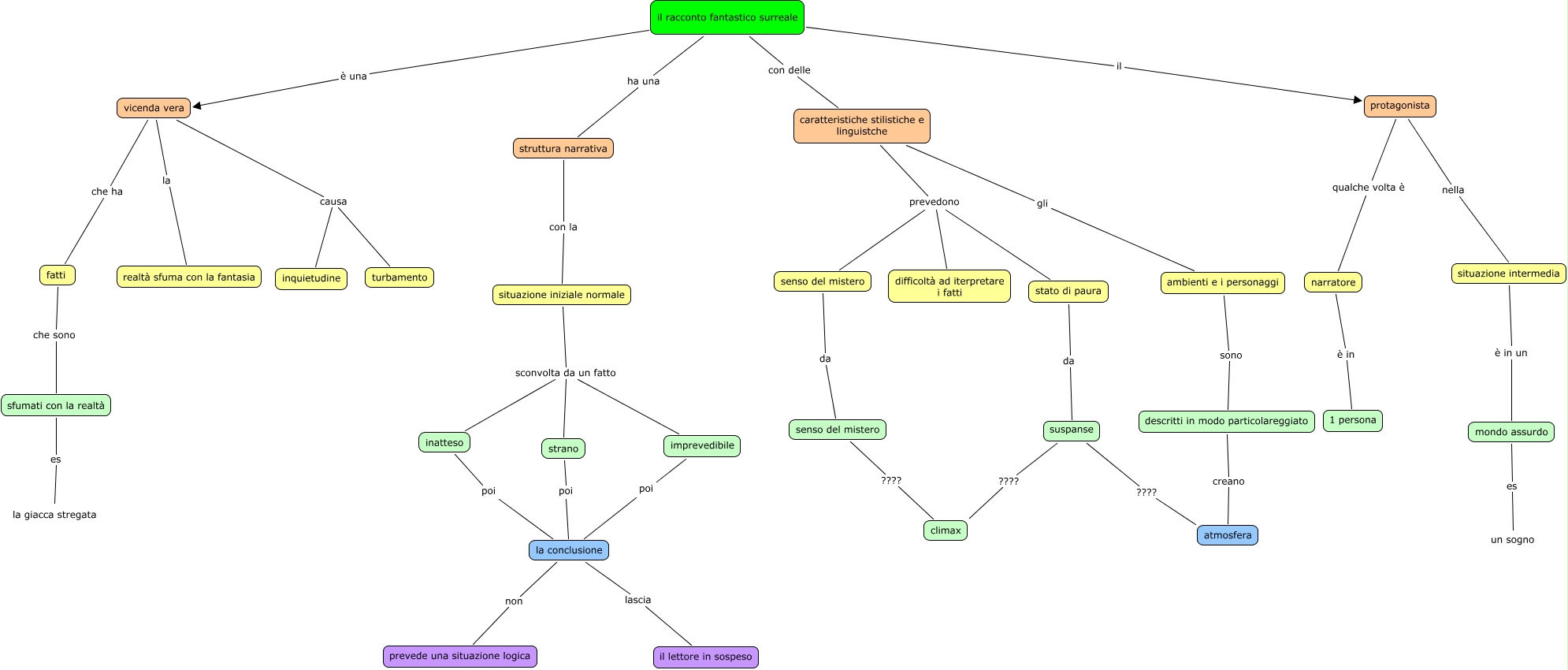 Questa Cmap, creata con IHMC CmapTools, contiene informazioni relative a: testo fantastico surreale, il racconto fantastico surreale è una vicenda vera, senso del mistero ???? climax, fatti che sono sfumati con la realtà, vicenda vera causa turbamento, situazione iniziale normale sconvolta da un fatto inatteso, imprevedibile poi la conclusione, strano poi la conclusione, il racconto fantastico surreale con delle caratteristiche stilistiche e linguistche, situazione intermedia è in un mondo assurdo, la conclusione lascia il lettore in sospeso, senso del mistero da senso del mistero, situazione iniziale normale sconvolta da un fatto strano, inatteso poi la conclusione, struttura narrativa con la situazione iniziale normale, caratteristiche stilistiche e linguistche prevedono senso del mistero, sfumati con la realtà es la giacca stregata, la conclusione non prevede una situazione logica, caratteristiche stilistiche e linguistche gli ambienti e i personaggi, caratteristiche stilistiche e linguistche prevedono difficoltà ad iterpretare i fatti, stato di paura da suspanse