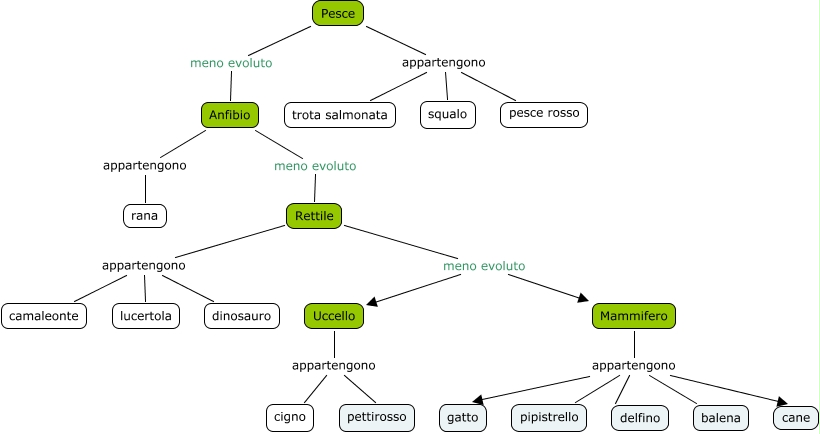 Questa Cmap, creata con IHMC CmapTools, contiene informazioni relative a: esercizio 3, Pesce meno evoluto Anfibio, Rettile appartengono camaleonte, Mammifero appartengono cane, Pesce appartengono trota salmonata, Rettile meno evoluto Uccello, Rettile appartengono dinosauro, Rettile meno evoluto Mammifero, Rettile appartengono lucertola, Mammifero appartengono delfino, Anfibio appartengono rana, Mammifero appartengono pipistrello, Mammifero appartengono balena, Mammifero appartengono gatto, Anfibio meno evoluto Rettile, Uccello appartengono pettirosso, Pesce appartengono squalo, Pesce appartengono pesce rosso, Uccello appartengono cigno
