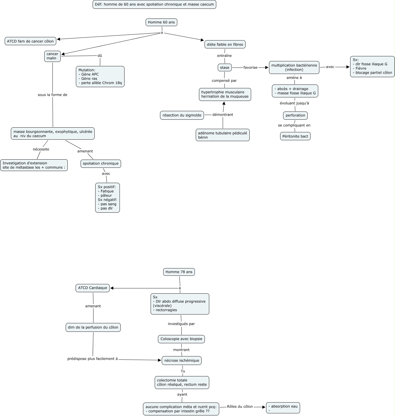 Cette carte conceptuelle, cree avec IHMC CmapTools, contient des informations liees a : APP 3 aller, multiplication bactérienne (infection) avec Sx: - dlr fosse iliaque G - Fièvre - blocage partiel côlon, masse bourgeonnante, exophytique, ulcérée au niv du caecum amenant spoliation chronique, masse bourgeonnante, exophytique, ulcérée au niv du caecum nécessite Investigation d'extension site de métastase les + communs :, aucune complication méta et nutrit pcq: - compensation par intestin grêle ?? Rôles du côlon - absorption eau -, ATCD Cardiaque amenant dim de la perfusion du côlon, résection du sigmoïde démontrant hypertrophie musculaire herniation de la muqueuse, Homme 78 ans a Sx - Dlr abdo diffuse progressive (viscérale) - rectorragies, perforation se compliquant en Péritonite bact, spoliation chronique avec Sx positif: - Fatique - pâleur Sx négatif: - pas sang - pas dlr, - abcès + drainage - masse fosse iliaque G évoluant jusqu'à perforation, Coloscopie avec biopsie montrant nécrose ischémique, Homme 78 ans a ATCD Cardiaque, nécrose ischémique Tx colectomie totale côlon réséqué, rectum reste, stase favorise multiplication bactérienne (infection), Homme 60 ans a ATCD fam de cancer côlon, cancer malin sous la forme de masse bourgeonnante, exophytique, ulcérée au niv du caecum, Homme 60 ans a diète faible en fibres, stase compensé par hypertrophie musculaire herniation de la muqueuse, dim de la perfusion du côlon prédispose plus facilement à nécrose ischémique, multiplication bactérienne (infection) amène à - abcès + drainage - masse fosse iliaque G