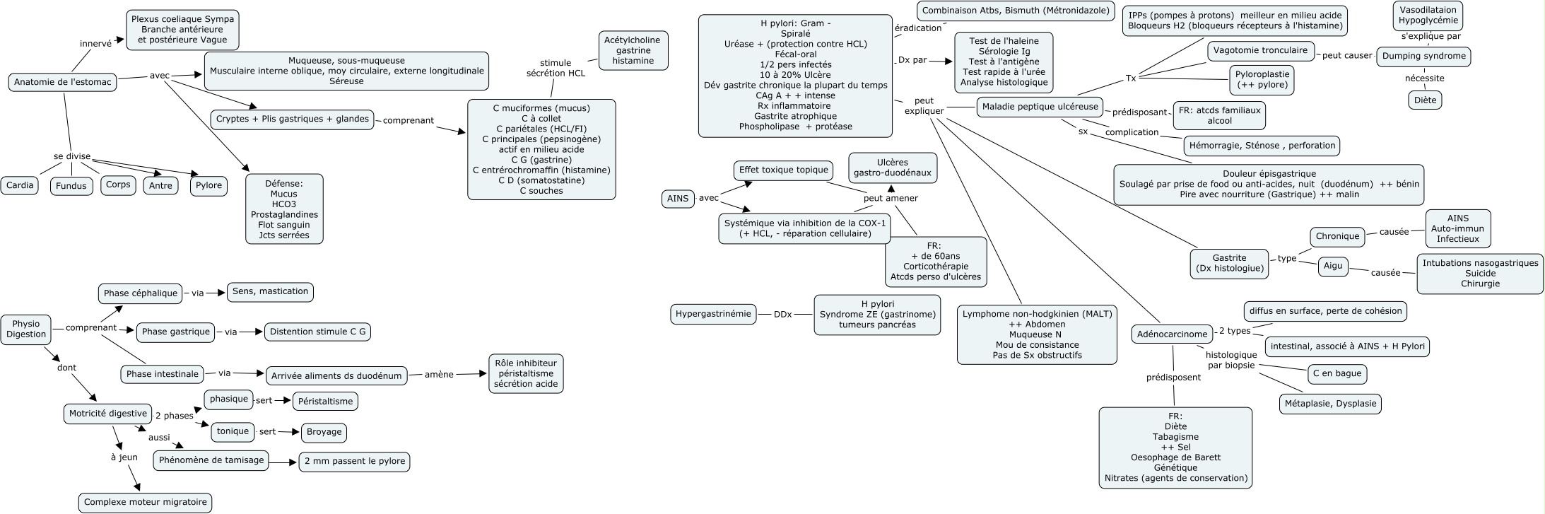 This Concept Map, created with IHMC CmapTools, has information related to: APP 2 Aller, Maladie peptique ulcéreuse complication Hémorragie, Sténose , perforation, Physio Digestion dont Motricité digestive, Physio Digestion comprenant Phase intestinale, Motricité digestive à jeun Complexe moteur migratoire, Anatomie de l'estomac se divise Cardia, AINS avec Effet toxique topique, tonique sert Broyage, Motricité digestive aussi Phénomène de tamisage, Chronique causée AINS Auto-immun Infectieux, Physio Digestion comprenant Phase céphalique, Maladie peptique ulcéreuse Tx Pyloroplastie (++ pylore), Gastrite (Dx histologiue) type Aigu, FR: + de 60ans Corticothérapie Atcds perso d'ulcères peut amener Ulcères gastro-duodénaux, Dumping syndrome nécessite Diète, Effet toxique topique peut amener Ulcères gastro-duodénaux, Adénocarcinome histologique par biopsie C en bague, Motricité digestive 2 phases phasique, Cryptes + Plis gastriques + glandes comprenant C muciformes (mucus) C à collet C pariétales (HCL/FI) C principales (pepsinogène) actif en milieu acide C G (gastrine) C entrérochromaffin (histamine) C D (somatostatine) C souches, Adénocarcinome 2 types diffus en surface, perte de cohésion, Anatomie de l'estomac avec Cryptes + Plis gastriques + glandes