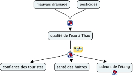 This Concept Map, created with IHMC CmapTools, has information related to: thau, pesticides - qualité de l'eau à Thau, qualité de l'eau à Thau + santé des huitres, mauvais drainage - qualité de l'eau à Thau, qualité de l'eau à Thau + odeurs de l'étang, qualité de l'eau à Thau + confiance des touristes