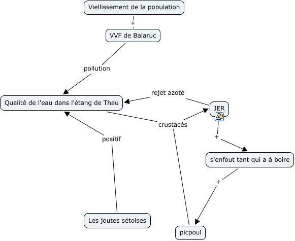 This Concept Map, created with IHMC CmapTools, has information related to: vincent, s'enfout tant qui a à boire + picpoul, Les joutes sétoises positif Qualité de l'eau dans l'étang de Thau, Qualité de l'eau dans l'étang de Thau crustacés JER, Viellissement de la population + VVF de Balaruc, VVF de Balaruc pollution Qualité de l'eau dans l'étang de Thau, picpoul crustacés JER, JER rejet azoté Qualité de l'eau dans l'étang de Thau, JER + s'enfout tant qui a à boire