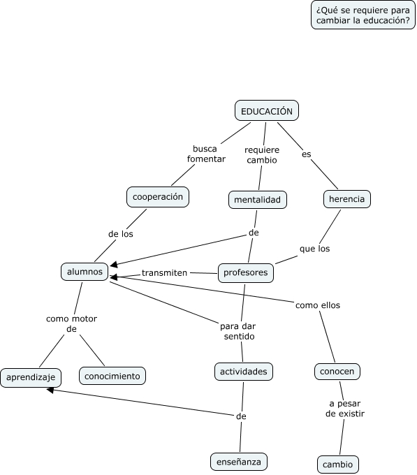 Este Cmap, tiene información relacionada con: Cambios en la deducación, profesores para dar sentido actividades, EDUCACIÓN busca fomentar cooperación, alumnos como motor de aprendizaje, alumnos como ellos conocen, EDUCACIÓN requiere cambio mentalidad, profesores transmiten alumnos, alumnos como motor de conocimiento, alumnos para dar sentido actividades, herencia que los profesores, actividades de enseñanza, conocen a pesar de existir cambio, mentalidad de profesores, EDUCACIÓN es herencia, mentalidad de alumnos, cooperación de los alumnos, actividades de aprendizaje