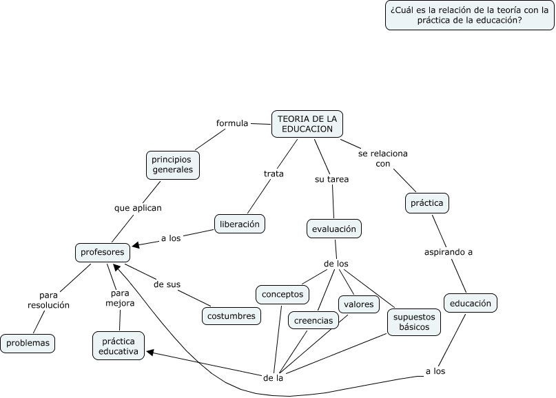 Este Cmap, tiene información relacionada con: Relación de la teoría con la práctica educativa, educación a los profesores, profesores para resolución problemas, valores de la práctica educativa, principios generales que aplican profesores, evaluación de los valores, TEORIA DE LA EDUCACION su tarea evaluación, práctica aspirando a educación, TEORIA DE LA EDUCACION trata liberación, conceptos de la práctica educativa, TEORIA DE LA EDUCACION formula principios generales, profesores para mejora práctica educativa, TEORIA DE LA EDUCACION se relaciona con práctica, profesores de sus costumbres, evaluación de los conceptos, evaluación de los supuestos básicos, supuestos básicos de la práctica educativa, creencias de la práctica educativa, liberación a los profesores, evaluación de los creencias