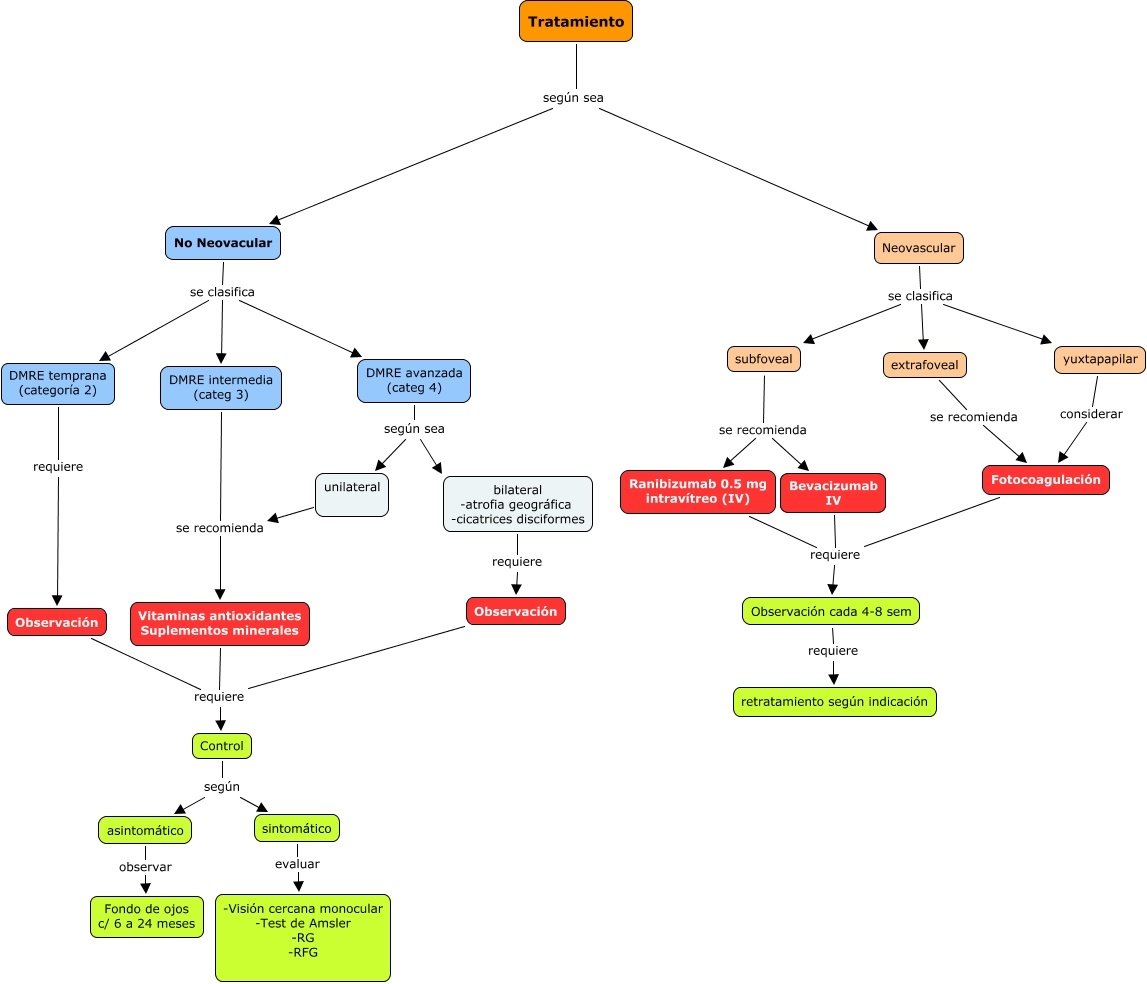 Este Cmap, tiene información relacionada con: EMRE Tto, Neovascular se clasifica yuxtapapilar, Control según sintomático, sintomático evaluar -Visión cercana monocular -Test de Amsler -RG -RFG, No Neovacular se clasifica DMRE temprana (categoría 2), subfoveal se recomienda Bevacizumab IV, Bevacizumab IV requiere Observación cada 4-8 sem, subfoveal se recomienda Ranibizumab 0.5 mg intravítreo (IV), extrafoveal se recomienda Fotocoagulación, Observación requiere Control, asintomático observar Fondo de ojos c/ 6 a 24 meses, Neovascular se clasifica extrafoveal, Tratamiento según sea Neovascular, bilateral -atrofia geográfica -cicatrices disciformes requiere Observación, yuxtapapilar considerar Fotocoagulación, Tratamiento según sea No Neovacular, Vitaminas antioxidantes Suplementos minerales requiere Control, DMRE avanzada (categ 4) según sea unilateral, No Neovacular se clasifica DMRE avanzada (categ 4), Control según asintomático, unilateral se recomienda Vitaminas antioxidantes Suplementos minerales