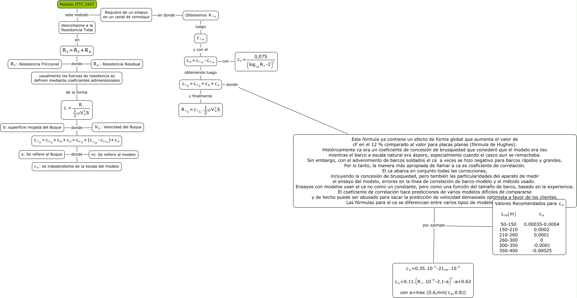 Este Cmap, tiene información relacionada con: Metodo ITTC 1957, <math xmlns="http://www.w3.org/1998/Math/MathML"> <mrow> <mmultiscripts> <mtext> c </mtext> <mtext> i </mtext> <none/> </mmultiscripts> <mtext> = </mtext> <mfrac> <mmultiscripts> <mtext> R </mtext> <mtext> i </mtext> <none/> </mmultiscripts> <mrow> <mfrac> <mtext> 1 </mtext> <mtext> 2 </mtext> </mfrac> <mtext> ρ </mtext> <mmultiscripts> <mtext> V </mtext> <mtext> S </mtext> <mtext> 2 </mtext> </mmultiscripts> <mtext> S </mtext> </mrow> </mfrac> </mrow> </math> donde <math xmlns="http://www.w3.org/1998/Math/MathML"> <mrow> <mmultiscripts> <mtext> V </mtext> <mtext> S </mtext> <none/> </mmultiscripts> <mtext> : Velocidad del Buque </mtext> </mrow> </math>, <math xmlns="http://www.w3.org/1998/Math/MathML"> <mrow> <mmultiscripts> <mtext> R </mtext> <mtext> F </mtext> <none/> </mmultiscripts> <mtext> : Resistencia Friccional </mtext> </mrow> </math> donde usualmente las fuerzas de resistencia se definen mediante coeficientes adimensionales, <math xmlns="http://www.w3.org/1998/Math/MathML"> <mrow> <mmultiscripts> <mtext> c </mtext> <mtext> i </mtext> <none/> </mmultiscripts> <mtext> = </mtext> <mfrac> <mmultiscripts> <mtext> R </mtext> <mtext> i </mtext> <none/> </mmultiscripts> <mrow> <mfrac> <mtext> 1 </mtext> <mtext> 2 </mtext> </mfrac> <mtext> ρ </mtext> <mmultiscripts> <mtext> V </mtext> <mtext> S </mtext> <mtext> 2 </mtext> </mmultiscripts> <mtext> S </mtext> </mrow> </mfrac> </mrow> </math> donde <math xmlns="http://www.w3.org/1998/Math/MathML"> <mrow> <mmultiscripts> <mtext> c </mtext> <mmultiscripts> <mtext> T </mtext> <mtext> S </mtext> <none/> </mmultiscripts> <none/> </mmultiscripts> <mtext> = </mtext> <mmultiscripts> <mtext> c </mtext> <mmultiscripts> <mtext> F </mtext> <mtext> S </mtext> <none/> </mmultiscripts> <none/> </mmultiscripts> <mtext> + </mtext> <mmultiscripts> <mtext> c </mtext> <mtext> R </mtext> <none/> </mmultiscripts> <mtext> + </mtext> <mmultiscripts> <mtext> c </mtext> <mtext> A </mtext> <none/> </mmultiscripts> <mtext> = </mtext> <mrow> <mmultiscripts> <mtext> c </mtext> <mmultiscripts> <mtext> F </mtext> <mtext> S </mtext> <none/> </mmultiscripts> <none/> </mmultiscripts> <mtext> + </mtext> <mmultiscripts> <mtext> (c </mtext> <mrow> <mmultiscripts> <mtext> T </mtext> <mtext> m </mtext> <none/> </mmultiscripts> </mrow> <none/> </mmultiscripts> <mtext> - </mtext> <mmultiscripts> <mtext> c </mtext> <mmultiscripts> <mtext> F </mtext> <mtext> m </mtext> <none/> </mmultiscripts> <none/> </mmultiscripts> <mtext> )+ </mtext> <mmultiscripts> <mtext> c </mtext> <mtext> A </mtext> <none/> </mmultiscripts> </mrow> </mrow> </math>, Este fórmula ya contiene un efecto de forma global que aumenta el valor de cF en el 12 % comparado al valor para placas planas (fórmula de Hughes). Históricamente ca era un coeficiente de concesión de brusquedad que consideró que el modelo era liso mientras el barco a escala natural era áspero, especialmente cuando el casco aun se remachaba. Sin embargo, con el advenimiento de barcos soldados el ca a veces se hizo negativo para barcos rápidos y grandes. Por lo tanto, la manera más apropiada de llamar a ca es coeficiente de correlación. El ca abarca en conjunto todas las correcciones, incluyendo la concesión de brusquedad, pero también las particularidades del aparato de medir el ensayo del modelo, errores en la línea de correlación de barco-modelo y el método usado. Ensayos con modelos usan el ca no como un constante, pero como una función del tamaño de barco, basado en la experiencia. El coeficiente de correlación hace predicciones de varios modelos difíciles de compararse y de hecho puede ser abusado para sacar la predicción de velocidad demasiado optimista a favor de los clientes. Las fórmulas para el ca se diferencian entre varios tipos de modelos y astilleros. por ejemplo <math xmlns="http://www.w3.org/1998/Math/MathML"> <mtable> <mtr> <mtd> <mrow> <mmultiscripts> <mtext> c </mtext> <mtext> A </mtext> <none/> </mmultiscripts> <mtext> =0.35. </mtext> <mmultiscripts> <mtext> 10 </mtext> <none/> <mtext> -3 </mtext> </mmultiscripts> <mtext> -2 </mtext> <mmultiscripts> <mtext> L </mtext> <mtext> pp </mtext> <none/> </mmultiscripts> <mtext> . </mtext> <mmultiscripts> <mtext> 10 </mtext> <none/> <mtext> -6 </mtext> </mmultiscripts> </mrow> </mtd> </mtr> <mtr> <mtd> <mrow> <mmultiscripts> <mtext> c </mtext> <mtext> A </mtext> <none/> </mmultiscripts> <mtext> =0.11. </mtext> <mmultiscripts> <mfenced open="(" close=")"> <mmultiscripts> <mtext> R </mtext> <mtext> n </mtext> <none/> </mmultiscripts> <mtext> . </mtext> <mmultiscripts> <mtext> 10 </mtext> <none/> <mtext> -9 </mtext> </mmultiscripts> <mtext> -2.1-a </mtext> </mfenced> <none/> <mtext> 2 </mtext> </mmultiscripts> <mtext> -a+0.62 </mtext> </mrow> </mtd> </mtr> <mtr> <mtd> <mtext> con a=max (0.6,min( </mtext> <mmultiscripts> <mtext> c </mtext> <mtext> B </mtext> <none/> </mmultiscripts> <mtext> ,0.8)) </mtext> </mtd> </mtr> </mtable> </math>, <math xmlns="http://www.w3.org/1998/Math/MathML"> <mrow> <mmultiscripts> <mtext> R </mtext> <mtext> F </mtext> <none/> </mmultiscripts> <mtext> : Resistencia Friccional </mtext> </mrow> </math> donde <math xmlns="http://www.w3.org/1998/Math/MathML"> <mrow> <mmultiscripts> <mtext> R </mtext> <mtext> R </mtext> <none/> </mmultiscripts> <mtext> : Resistencia Residual </mtext> </mrow> </math>, descompone a la Resistencia Total en <math xmlns="http://www.w3.org/1998/Math/MathML"> <mrow> <mmultiscripts> <mtext> R </mtext> <mtext> T </mtext> <none/> </mmultiscripts> <mtext> = </mtext> <mmultiscripts> <mtext> R </mtext> <mtext> F </mtext> <none/> </mmultiscripts> <mtext> + </mtext> <mmultiscripts> <mtext> R </mtext> <mtext> R </mtext> <none/> </mmultiscripts> </mrow> </math>, Requiere de un ensayo en un canal de remolque en donde <math xmlns="http://www.w3.org/1998/Math/MathML"> <mrow> <mtext> Obtenemos </mtext> <mmultiscripts> <mtext> R </mtext> <mmultiscripts> <mtext> T </mte