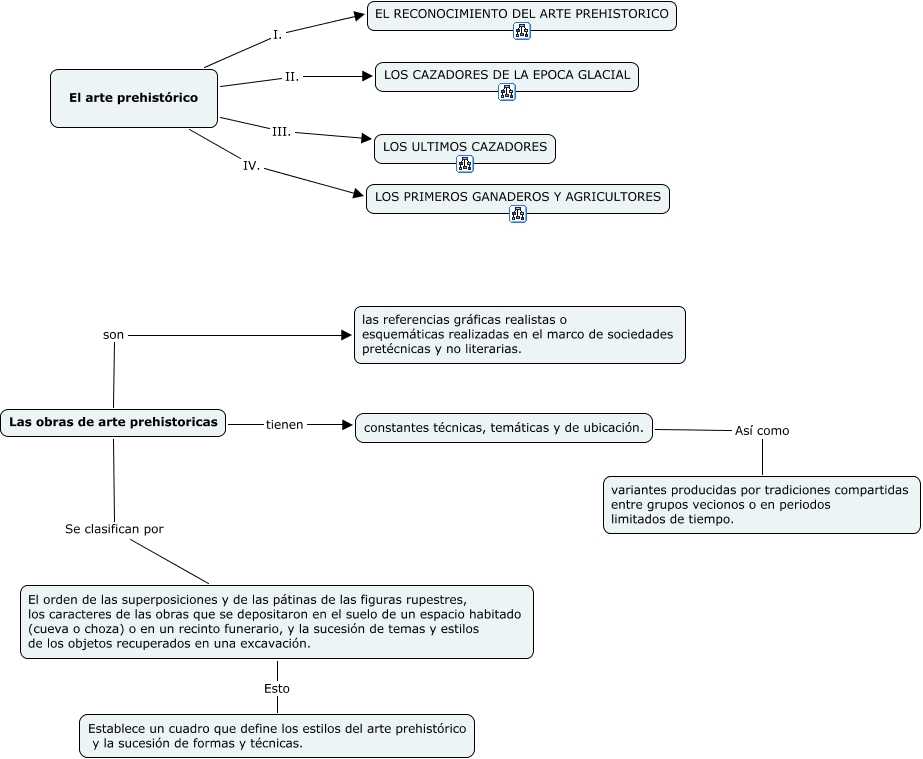 This Concept Map, created with IHMC CmapTools, has information related to: artePrehistorico01, El arte prehistórico II. LOS CAZADORES DE LA EPOCA GLACIAL, El arte prehistórico III. LOS ULTIMOS CAZADORES, El arte prehistórico I. EL RECONOCIMIENTO DEL ARTE PREHISTORICO, Las obras de arte prehistoricas Se clasifican por El orden de las superposiciones y de las pátinas de las figuras rupestres, los caracteres de las obras que se depositaron en el suelo de un espacio habitado (cueva o choza) o en un recinto funerario, y la sucesión de temas y estilos de los objetos recuperados en una excavación., Las obras de arte prehistoricas tienen constantes técnicas, temáticas y de ubicación., constantes técnicas, temáticas y de ubicación. Así como variantes producidas por tradiciones compartidas entre grupos vecionos o en periodos limitados de tiempo., Las obras de arte prehistoricas son las referencias gráficas realistas o esquemáticas realizadas en el marco de sociedades pretécnicas y no literarias., El orden de las superposiciones y de las pátinas de las figuras rupestres, los caracteres de las obras que se depositaron en el suelo de un espacio habitado (cueva o choza) o en un recinto funerario, y la sucesión de temas y estilos de los objetos recuperados en una excavación. Esto Establece un cuadro que define los estilos del arte prehistórico y la sucesión de formas y técnicas., El arte prehistórico IV. LOS PRIMEROS GANADEROS Y AGRICULTORES