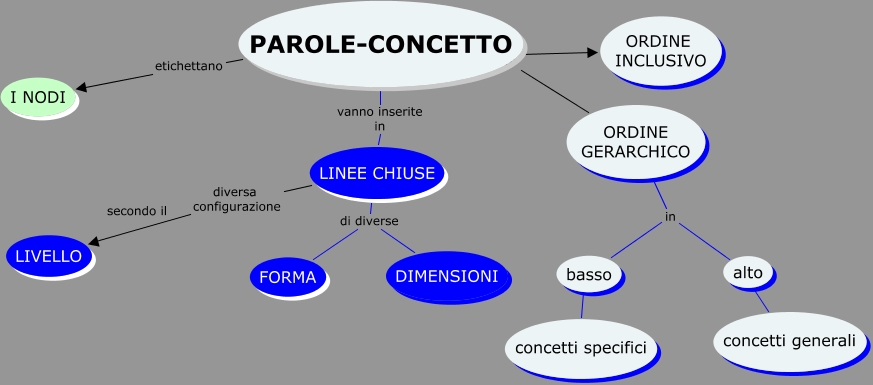 Questa Mappa Concettuale ha informazioni correlate a: parole-concetto, PAROLE-CONCETTO vanno inserite in LINEE CHIUSE, PAROLE-CONCETTO etichettano I NODI, LINEE CHIUSE di diverse FORMA, PAROLE-CONCETTO vanno scritte ORDINE INCLUSIVO, LINEE CHIUSE di diverse DIMENSIONI, PAROLE-CONCETTO vanno scritte ORDINE GERARCHICO, LINEE CHIUSE diversa configurazione LIVELLO, ORDINE GERARCHICO in alto, basso ???? concetti specifici, alto ???? concetti generali, ORDINE GERARCHICO in basso