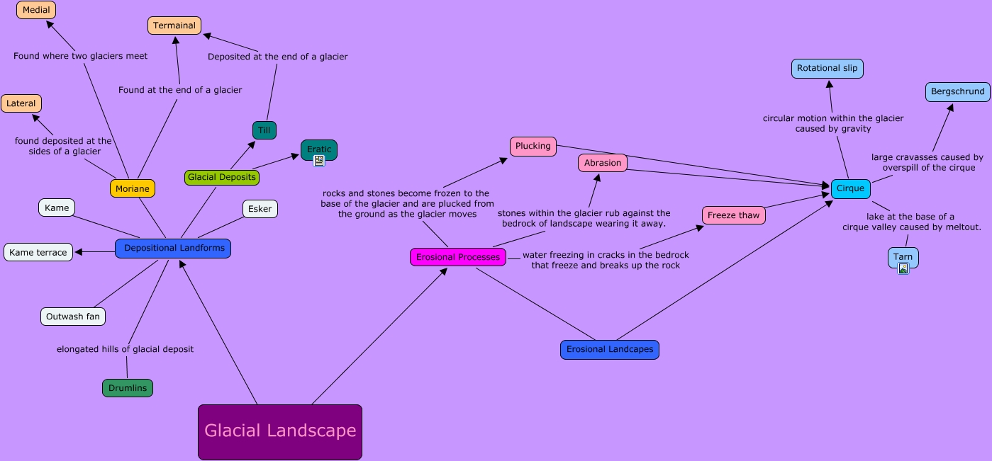 Glacial Landforms, Moriane found deposited at the sides of a glacier Lateral, Erosional Processes water freezing in cracks in the bedrock that freeze and breaks up the rock Freeze thaw, Glacial Landscape ???? Erosional Processes, Depositional Landforms Glacial Deposits Till, Freeze thaw ???? Cirque, Abrasion ???? Cirque, Erosional Processes rocks and stones become frozen to the base of the glacier and are plucked from the ground as the glacier moves Plucking, Depositional Landforms ???? Kame terrace, Depositional Landforms ???? Kame, Erosional Landcapes ???? Cirque