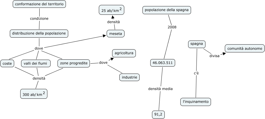 Questa Cmap, creata con IHMC CmapTools, contiene informazioni relative a: popolazione spagna, coste densità <math xmlns="http://www.w3.org/1998/Math/MathML"> <mrow> <mtext> 300 ab/ </mtext> <mmultiscripts> <mtext> km </mtext> <none/> <mtext> 2 </mtext> </mmultiscripts> </mrow> </math>, conformazione del territorio condizione distribuzione della popolazione, distribuzione della popolazione dove coste, distribuzione della popolazione dove zone progredite, distribuzione della popolazione dove valli dei fiumi, valli dei fiumi densità <math xmlns="http://www.w3.org/1998/Math/MathML"> <mrow> <mtext> 300 ab/ </mtext> <mmultiscripts> <mtext> km </mtext> <none/> <mtext> 2 </mtext> </mmultiscripts> </mrow> </math>, zone progredite dove industrie, distribuzione della popolazione dove meseta, 46.063.511 densità media 91,2, spagna divisa comunità autonome, meseta densità <math xmlns="http://www.w3.org/1998/Math/MathML"> <mrow> <mtext> 25 ab/ </mtext> <mmultiscripts> <mtext> km </mtext> <none/> <mtext> 2 </mtext> </mmultiscripts> </mrow> </math>, zone progredite densità <math xmlns="http://www.w3.org/1998/Math/MathML"> <mrow> <mtext> 300 ab/ </mtext> <mmultiscripts> <mtext> km </mtext> <none/> <mtext> 2 </mtext> </mmultiscripts> </mrow> </math>, popolazione della spagna 2008 46.063.511, zone progredite dove agricoltura, spagna c'è l'inquinamento