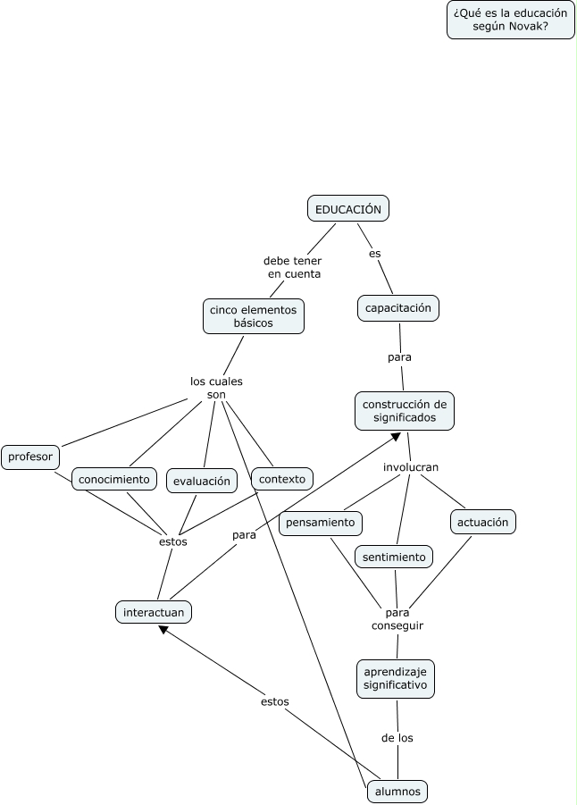 Este Cmap, tiene información relacionada con: Educación, cinco elementos básicos los cuales son alumnos, cinco elementos básicos los cuales son profesor, contexto estos interactuan, actuación para conseguir aprendizaje significativo, cinco elementos básicos los cuales son contexto, aprendizaje significativo de los alumnos, EDUCACIÓN es capacitación, pensamiento para conseguir aprendizaje significativo, evaluación estos interactuan, construcción de significados involucran pensamiento, EDUCACIÓN debe tener en cuenta cinco elementos básicos, alumnos estos interactuan, conocimiento estos interactuan, profesor estos interactuan, construcción de significados involucran sentimiento, construcción de significados involucran actuación, interactuan para construcción de significados, cinco elementos básicos los cuales son conocimiento, cinco elementos básicos los cuales son evaluación, capacitación para construcción de significados
