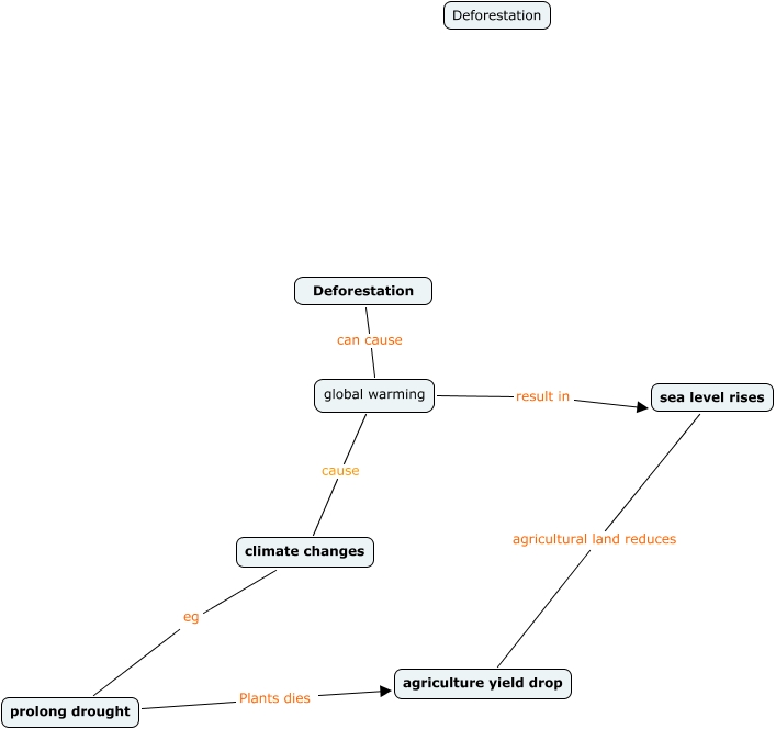 This Concept Map, created with IHMC CmapTools, has information related to: Nancy's Deforestation, climate changes eg prolong drought, Deforestation can cause global warming, global warming result in sea level rises, sea level rises agricultural land reduces agriculture yield drop, global warming cause climate changes, prolong drought Plants dies agriculture yield drop