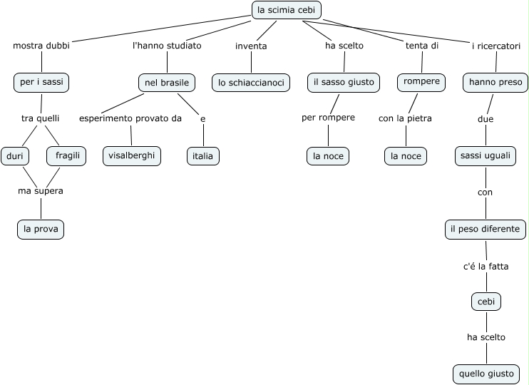 Questa Cmap, creata con IHMC CmapTools, contiene informazioni relative a: scimmie, la scimia cebi mostra dubbi per i sassi, fragili ma supera la prova, nel brasile e italia, rompere con la pietra la noce, sassi uguali con il peso diferente, per i sassi tra quelli duri, la scimia cebi l'hanno studiato nel brasile, per i sassi tra quelli fragili, la scimia cebi tenta di rompere, cebi ha scelto quello giusto, il sasso giusto per rompere la noce, duri ma supera la prova, il peso diferente c'é la fatta cebi, la scimia cebi ha scelto il sasso giusto, nel brasile esperimento provato da visalberghi, hanno preso due sassi uguali, la scimia cebi i ricercatori hanno preso, la scimia cebi inventa lo schiaccianoci