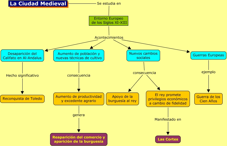 Este Cmap, tiene información relacionada con: Ciudad Medieval, Desaparición del Califato en Al-Andalus Hecho significativo Reconquista de Toledo, Entorno Europeo de los Siglos XI-XIII Acontecimientos Aumento de población y nuevas técnicas de cultivo, Entorno Europeo de los Siglos XI-XIII Acontecimientos Nuevos cambios sociales, Entorno Europeo de los Siglos XI-XIII Acontecimientos Desaparición del Califato en Al-Andalus, Entorno Europeo de los Siglos XI-XIII Acontecimientos Guerras Europeas, La Ciudad Medieval Se estudia en Entorno Europeo de los Siglos XI-XIII, Aumento de productividad y excedente agrario genera Reaparición del comercio y aparición de la burguesía, Nuevos cambios sociales consecuencia El rey promete privilegios económicos a cambio de fidelidad, Guerras Europeas ejemplo Guerra de los Cien Años, El rey promete privilegios económicos a cambio de fidelidad Manifestado en Las Cortes, Aumento de población y nuevas técnicas de cultivo consecuencia Aumento de productividad y excedente agrario, Nuevos cambios sociales consecuencia Apoyo de la burguesía al rey