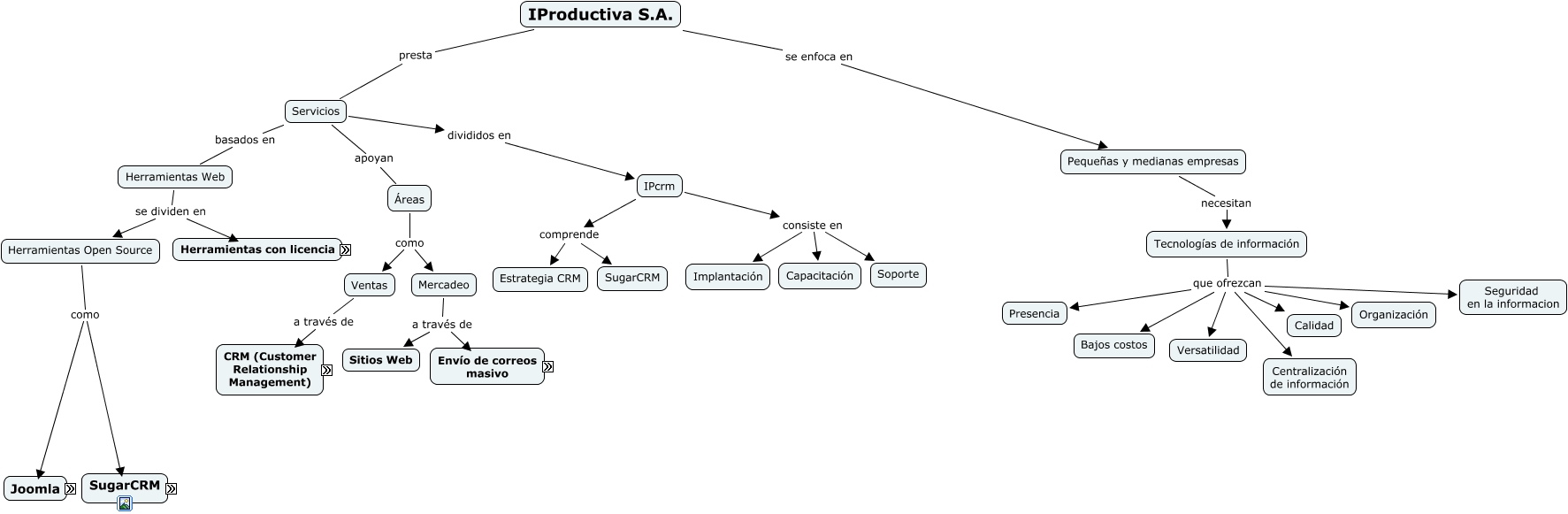 Este Cmap, tiene información relacionada con: IProductiva, Tecnologías de información que ofrezcan Bajos costos, IProductiva S.A. presta Servicios, Herramientas Open Source como SugarCRM, Áreas como Ventas, Envío de correos masivo mejora Rentabilidad, Gestor de contenidos permite Organización de los temas por categorías, CRM se traduce en Incremento de ventas, Gestor de contenidos permite Extensiones, Informes acerca Envío de correos masivos, IPcrm consiste en Capacitación, Creación de usuarios para Enviar correos, Herramientas Open Source como Joomla!, Integración con otros sistemas como Mozilla Thunderbird, IPcrm consiste en Soporte, Informes detallan Efectividad de la campaña de mercadeo, Ventas a través de CRM, SugarCRM permite Administración de campañas de mercadeo, Joomla! es un Gestor de contenidos, Envío de correos masivo mejora Costos, Extensiones desarrolladas por Empresas desarrolladoras