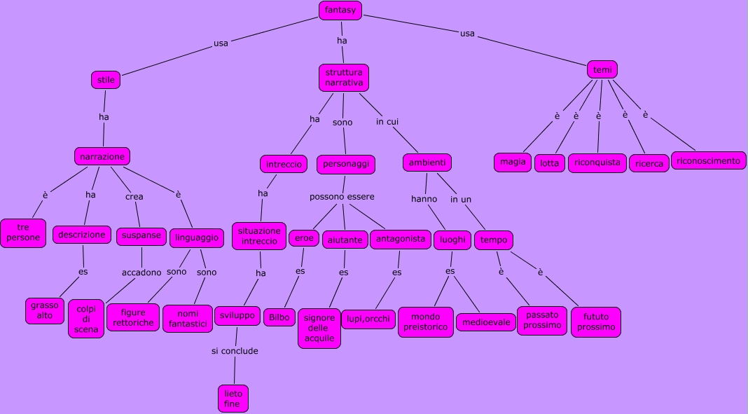 Questa Cmap, creata con IHMC CmapTools, contiene informazioni relative a: fantasy, sviluppo si conclude lieto fine, temi è riconquista, tempo è passato prossimo, tempo è fututo prossimo, temi è lotta, suspanse accadono colpi di scena, stile ha narrazione, fantasy ha struttura narrativa, ambienti in un tempo, intreccio ha situazione intreccio, linguaggio sono figure rettoriche, narrazione ha descrizione, linguaggio sono nomi fantastici, descrizione es grasso alto, personaggi possono essere eroe, antagonista possono essere aiutante, narrazione è linguaggio, struttura narrativa in cui ambienti, temi è riconoscimento, eroe es Bilbo