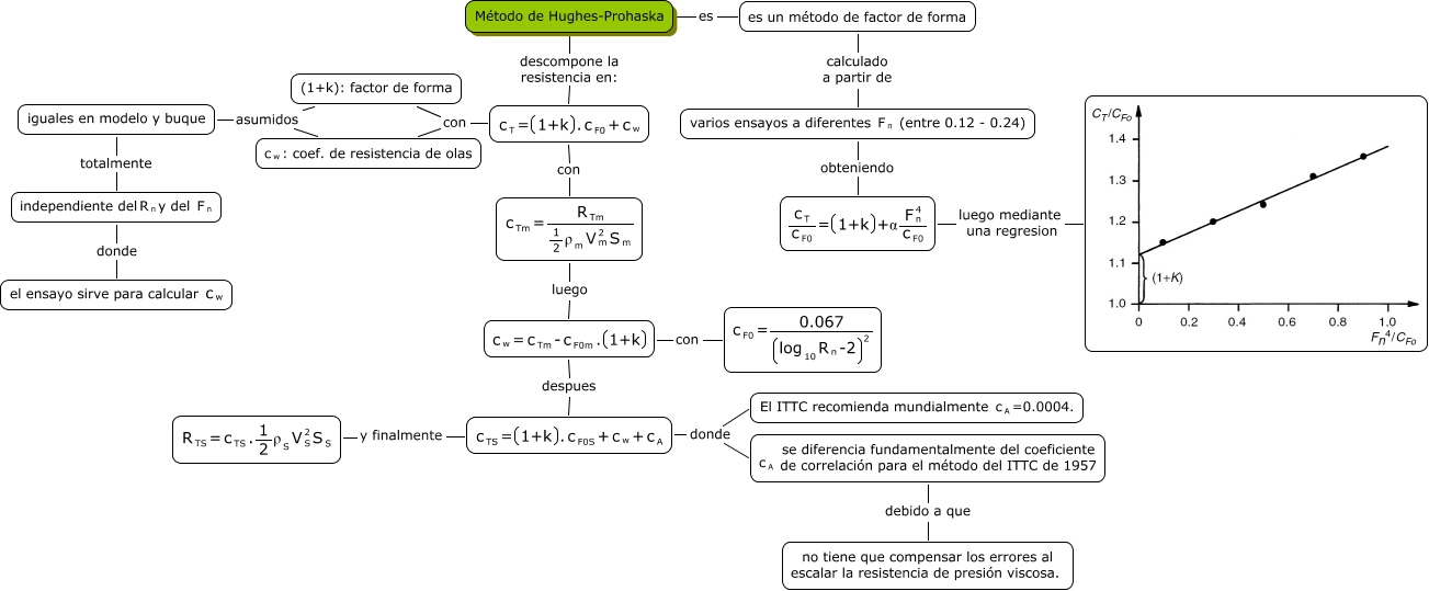 Este Cmap, tiene información relacionada con: Metodo de Hughes-Prohaska, (1+k): factor de forma asumidos <math xmlns="http://www.w3.org/1998/Math/MathML"> <mrow> <mmultiscripts> <mtext> c </mtext> <mtext> w </mtext> <none/> </mmultiscripts> <mtext> : coef. de resistencia de olas </mtext> </mrow> </math>, <math xmlns="http://www.w3.org/1998/Math/MathML"> <mrow> <mmultiscripts> <mtext> c </mtext> <mtext> w </mtext> <none/> </mmultiscripts> <mtext> = </mtext> <mrow> <mmultiscripts> <mtext> c </mtext> <mtext> Tm </mtext> <none/> </mmultiscripts> <mtext> - </mtext> <mmultiscripts> <mtext> c </mtext> <mtext> F0m </mtext> <none/> </mmultiscripts> <mtext> . </mtext> <mfenced open="(" close=")"> <mtext> 1+k </mtext> </mfenced> </mrow> </mrow> </math> con <math xmlns="http://www.w3.org/1998/Math/MathML"> <mmultiscripts> <mtext> c </mtext> <mtext> F0 </mtext> <none/> </mmultiscripts> <mtext> = </mtext> <mfrac> <mtext> 0.067 </mtext> <mmultiscripts> <mfenced open="(" close=")"> <mrow> <mmultiscripts> <mtext> log </mtext> <mtext> 10 </mtext> <none/> </mmultiscripts> <mmultiscripts> <mtext> R </mtext> <mtext> n </mtext> <none/> </mmultiscripts> <mtext> -2 </mtext> </mrow> </mfenced> <none/> <mtext> 2 </mtext> </mmultiscripts> </mfrac> </math>, (1+k): factor de forma asumidos <math xmlns="http://www.w3.org/1998/Math/MathML"> <mtext> iguales en modelo y buque </mtext> </math>, <math xmlns="http://www.w3.org/1998/Math/MathML"> <mrow> <mmultiscripts> <mtext> c </mtext> <mtext> TS </mtext> <none/> </mmultiscripts> <mtext> = </mtext> <mfenced open="(" close=")"> <mtext> 1+k </mtext> </mfenced> <mtext> . </mtext> <mmultiscripts> <mtext> c </mtext> <mtext> F0S </mtext> <none/> </mmultiscripts> <mtext> + </mtext> <mmultiscripts> <mtext> c </mtext> <mtext> w </mtext> <none/> </mmultiscripts> <mtext> + </mtext> <mmultiscripts> <mtext> c </mtext> <mtext> A </mtext> <none/> </mmultiscripts> </mrow> </math> donde <math xmlns="http://www.w3.org/1998/Math/MathML"> <mrow> <mmultiscripts> <mtext> c </mtext> <mtext> A </mtext> <none/> </mmultiscripts> <mtext> se diferencia fundamentalmente del coeficiente
