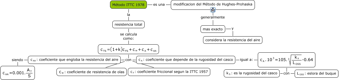 Este Cmap, tiene información relacionada con: Metodo ITTC 1978, <math xmlns="http://www.w3.org/1998/Math/MathML"> <mrow> <mmultiscripts> <mtext> c </mtext> <mtext> A </mtext> <none/> </mmultiscripts> <mtext> : coeficiente que depende de la rugosidad del casco </mtext> </mrow> </math> igual a: <math xmlns="http://www.w3.org/1998/Math/MathML"> <mrow> <mmultiscripts> <mtext> c </mtext> <mtext> A </mtext> <none/> </mmultiscripts> <mtext> . </mtext> <mmultiscripts> <mtext> 10 </mtext> <none/> <mtext> 3 </mtext> </mmultiscripts> <mtext> =105. </mtext> <mroot> <mfrac> <mmultiscripts> <mtext> k </mtext> <mtext> s </mtext> <none/> </mmultiscripts> <mmultiscripts> <mtext> L </mtext> <mtext> OSS </mtext> <none/> </mmultiscripts> </mfrac> <mtext> 3 </mtext> </mroot> <mtext> -0.64 </mtext> </mrow> </math>, <math xmlns="http://www.w3.org/1998/Math/MathML"> <mrow> <mmultiscripts> <mtext> c </mtext> <mtext> TS </mtext> <none/> </mmultiscripts> <mtext> = </mtext> <mfenced open="(" close=")"> <mtext> 1+k </mtext> </mfenced> <mmultiscripts> <mtext> c </mtext> <mtext> FS </mtext> <none/> </mmultiscripts> <mtext> + </mtext> <mmultiscripts> <mtext> c </mtext> <mtext> w </mtext> <none/> </mmultiscripts> <mtext> + </mtext> <mmultiscripts> <mtext> c </mtext> <mtext> A </mtext> <none/> </mmultiscripts> <mtext> + </mtext> <mmultiscripts> <mtext> c </mtext> <mtext> AA </mtext> <none/> </mmultiscripts> </mrow> </math> con <math xmlns="http://www.w3.org/1998/Math/MathML"> <mrow> <mmultiscripts> <mtext> c </mtext> <mtext> A </mtext> <none/> </mmultiscripts> <mtext> : coeficiente que depende de la rugosidad del casco </mtext> </mrow> </math>, <math xmlns="http://www.w3.org/1998/Math/MathML"> <mrow> <mmultiscripts> <mtext> c </mtext> <mtext> TS </mtext> <none/> </mmultiscripts> <mtext> = </mtext> <mfenced open="(" close=")"> <mtext> 1+k </mtext> </mfenced> <mmultiscripts> <mtext> c </mtext> <mtext> FS </mtext> <none/> </mmultiscripts> <mtext> + </mtext> <mmultiscripts> <mtext> c </mtext> <mtext> w </mtext> <none/> </mmultiscripts> <mtext> + </mtext> <mmultiscripts> <mtext> c </mtext> <mtext> A </mtext> <none/> </mmultiscripts> <mtext> + </mtext> <mmultiscripts> <mtext> c </mtext> <mtext> AA </mtext> <none/> </mmultiscripts> </mrow> </math> con <math xmlns="http://www.w3.org/1998/Math/MathML"> <mrow> <mmultiscripts> <mtext> c </mtext> <mtext> AA </mtext> <none/> </mmultiscripts> <mtext> : coeficiente que engloba la resistencia del aire </mtext> </mrow> </math>, <math xmlns="http://www.w3.org/1998/Math/MathML"> <mrow> <mmultiscripts> <mtext> c </mtext> <mtext> A </mtext> <none/> </mmultiscripts> <mtext> . </mtext> <mmultiscripts> <mtext> 10 </mtext> <none/> <mtext> 3 </mtext> </mmultiscripts> <mtext> =105. </mtext> <mroot> <mfrac> <mmultiscripts> <mtext> k </mtext> <mtext> s </mtext> <none/> </mmultiscripts> <mmultiscripts> <mtext> L </mtext> <mtext> OSS </mtext> <none/> </mmultiscripts> </mfrac> <mtext> 3 </mtext> </mroot> <mtext> -0.64 </mtext> </mrow> </math> con <math xmlns="http://www.w3.org/1998/Math/MathML"> <mrow> <mmultiscripts> <mtext> k </mtext> <mtext> S </mtext> <none/> </mmultiscripts> <mtext> : es la rugosidad del casco </mtext> </mrow> </math>, mas exacto y considera la resistencia del aire, resistencia total se calcula como: <math xmlns="http://www.w3.org/1998/Math/MathML"> <mrow> <mmultiscripts> <mtext> c </mtext> <mtext> TS </mtext> <none/> </mmultiscripts> <mtext> = </mtext> <mfenced open="(" close=")"> <mtext> 1+k </mtext> </mfenced> <mmultiscripts> <mtext> c </mtext> <mtext> FS </mtext> <none/> </mmultiscripts> <mtext> + </mtext> <mmultiscripts> <mtext> c </mtext> <mtext> w </mtext> <none/> </mmultiscripts> <mtext> + </mtext> <mmultiscripts> <mtext> c </mtext> <mtext> A </mtext> <none/> </mmultiscripts> <mtext> + </mtext> <mmultiscripts> <mtext> c </mtext> <mtext> AA </mtext> <none/> </mmultiscripts> </mrow> </math>, <math xmlns="http://www.w3.org/1998/Math/MathML"> <mrow> <mmultiscripts> <mtext> c </mtext> <mtext> AA </mtext> <none/> </mmultiscripts> <mtext> : coeficiente que engloba la resistencia del aire </mtext> </mrow> </math> siendo <math xmlns="http://www.w3.org/1998/Math/MathML"> <mrow> <mmultiscripts> <mtext> c </mtext> <mtext> AA </mtext> <none/> </mmultiscripts> <mtext> =0.001. </mtext> <mfrac> <mmultiscripts> <mtext> A </mtext> <mtext> T </mtext> <none/> </mmultiscripts> <mtext> S </mtext> </mfrac> </mrow> </math>, <math xmlns="http://www.w3.org/1998/Math/MathML"> <mrow> <mmultiscripts> <mtext> c </mtext> <mtext> TS </mtext> <none/> </mmultiscripts> <mtext> = </mtext> <mfenced open="(" close=")"> <mtext> 1+k </mtext> </mfenced> <mmultiscripts> <mtext> c </mtext> <mtext> FS </mtext> <none/> </mmultiscripts> <mtext> + </mtext> <mmultiscripts> <mtext> c </mtext> <mtext> w </mtext> <none/> </mmultiscripts> <mtext> + </mtext> <mmultiscripts> <mtext> c </mtext> <mtext> A </mtext> <none/> </mmultiscripts> <mtext> + </mtext> <mmultiscripts> <mtext> c </mtext> <mtext> AA </mtext> <none/> </mmultiscripts> </mrow> </math> con <math xmlns="http://www.w3.org/1998/Math/MathML"> <mrow> <mmultiscripts> <mtext> c </mtext> <mtext> F </mtext> <none/> </mmultiscripts> <mtext> : coeficiente friccional segun la ITTC 1957 </mtext> </mrow> </math>, <math xmlns="http://www.w3.org/1998/Math/MathML"> <mrow> <mmultiscripts> <mtext> c </mtext> <mtext> TS </mtext> <none/> </mmultiscripts> <mtext> = </mtext> <mfenced open="(" close=")"> <mtext> 1+k </mtext> </mfenced> <mmultiscripts> <mtext> c </mtext> <mtext> FS </mtext> <none/> </mmultiscripts> <mtext> + </mtext> <mmultiscripts> <mtext> c </mtext> <mtext> w </mtext> <none/> </mmultiscripts> <mtext> + </mtext> <mmultiscripts> <mtext> c </mtext> <mtext> A </mtext> <none/> </mmultiscripts> <mtext> + </mtext> <mmultiscripts> <mtext> c </mtext> <mtext> AA </mtext> <none/> </mmultiscripts> </mrow> </math> con <math xmlns="http://www.w3.org/1998/Math/MathML"> <mrow> <mmultiscripts> <mtext> c </mtext> <mtext> w </mtext> <none/> </mmultiscripts> <mtext> : coeficiente de res
